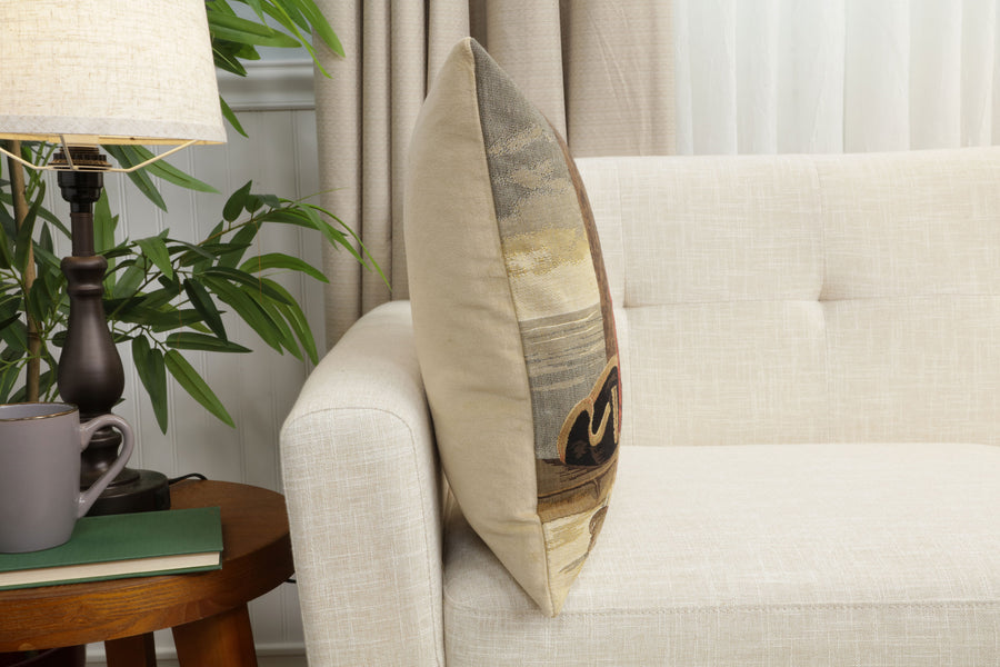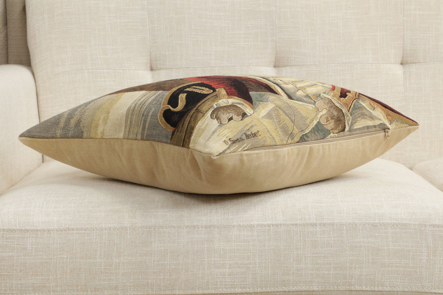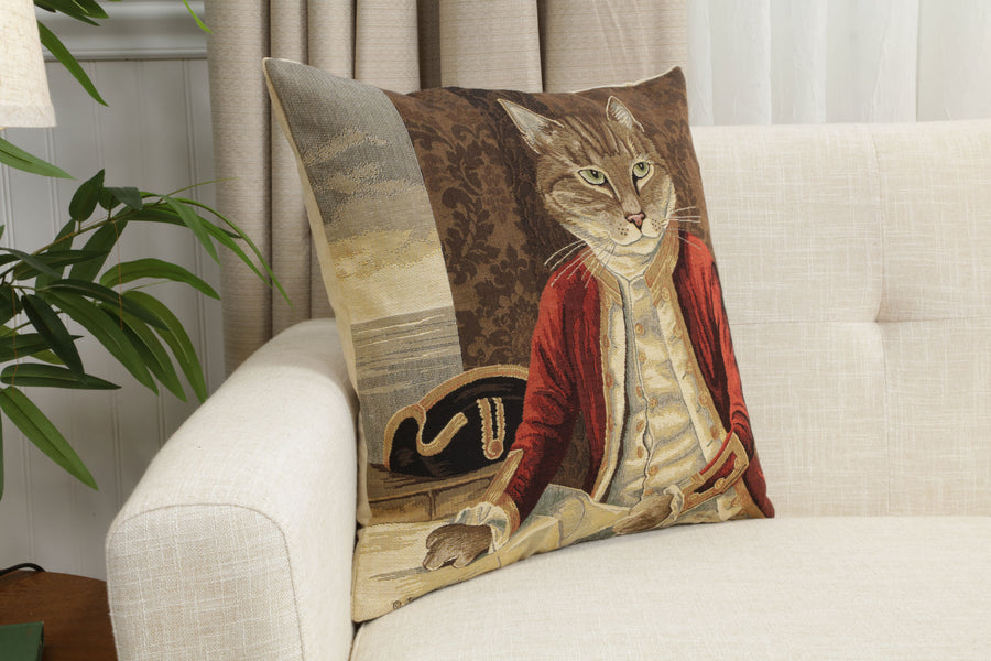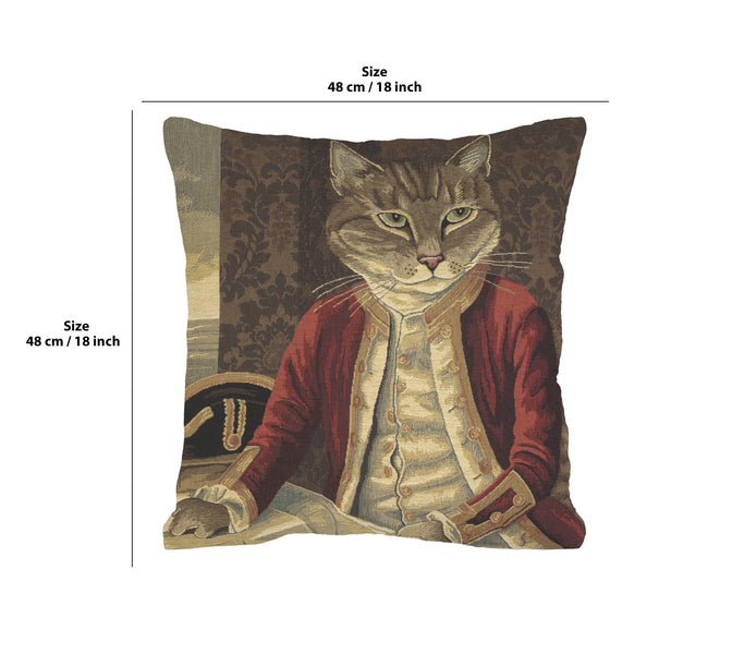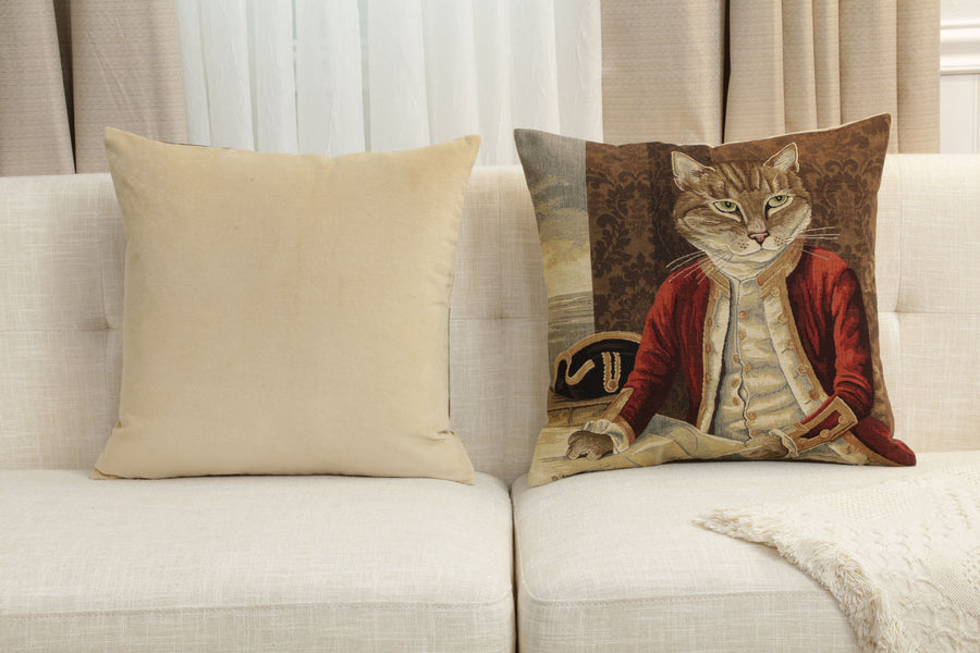| History: | Introducing our Herbert Cats B Belgian Cushion Cover, featuring the whimsical artwork of renowned artist Susan Herbert. This design portrays a grey-brown tabby with light green eyes, clad in a red coat with yellow and cream accents. On the table in front of him, his paws rest on a document and a colonial tricorne style hat sits to one side. The palette is one of muted browns, creams, and reds. In the background, we see a serene backdrop of water and a damask patterned curtain. Meticulously woven in Belgium using high-quality materials, each piece ensures durability and craftsmanship. Backed with sumptuous Belgian velvet, this cushion cover offers both visual appeal and tactile comfort. Ideal for cat enthusiasts or art lovers, it adds charm and sophistication to any space, serving as a unique statement piece and conversation starter. |