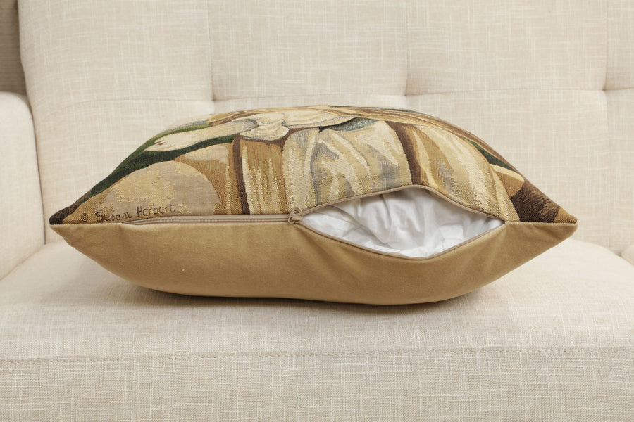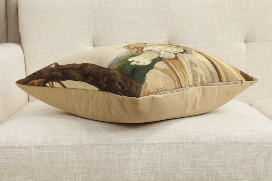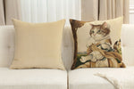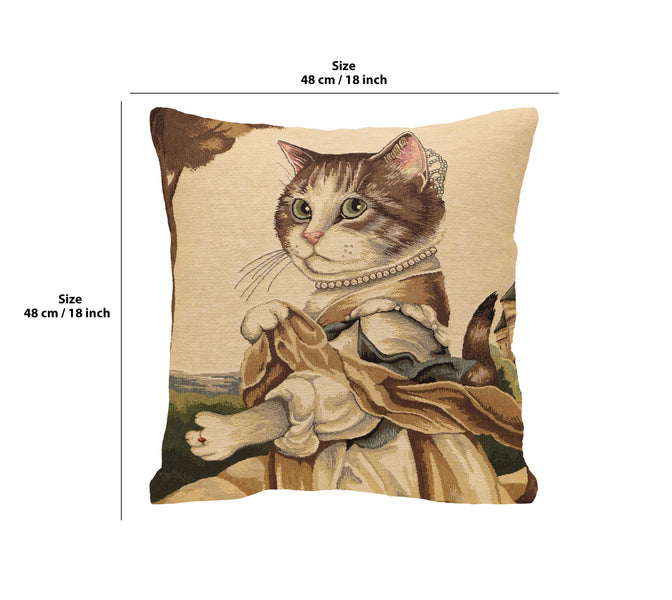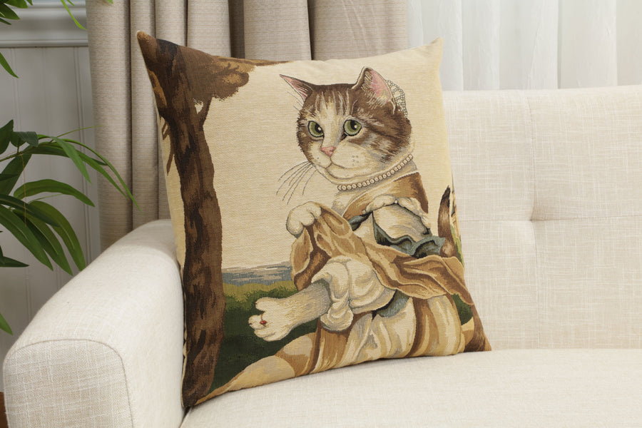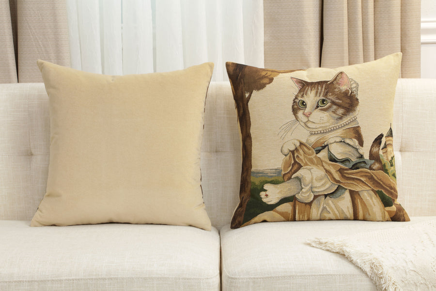 | History: | Introducing our Herbert Cats C Belgian Cushion Cover, featuring Susan Herbert's intricate artwork renowned for whimsical cat portrayals. This design showcases a grey-brown tabby with light green eyes, embellished with a pearl necklace, hairpiece, and a red ring on one paw. Dressed in Renaissance-style attire against a beige backdrop with muted tones, the scene includes a distant manor house or perhaps a castle, enhancing its depth. Crafted with jacquard-woven tapestry, this European throw pillow cover epitomizes elegance and durability. Backed with luxurious Belgian velvet, it offers both aesthetic charm and tactile comfort, ideal for cat lovers or art enthusiasts seeking sophistication in their living spaces. This cushion cover serves as a captivating conversation starter and a unique statement piece, adding whimsy and sophistication to any decor. |