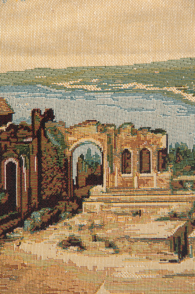 | History: | Taormina is an Italian jacquard wall tapestry. It portrays a view of the Ancient Theater of Taormina, an ancient Greek theater, in Taormina, southern Italy, built early in the seventh century BC. It is one of the most celebrated ruins in Sicily, on account both of its remarkable preservation and of the surpassing beauty of its situation. It is built for the most part of brick, and is therefore probably of Roman date, though the plan and arrangement are in accordance with those of Greek, rather than Roman, theaters; whence it is supposed that the present structure was rebuilt upon the foundations of an older theater of the Greek period. |