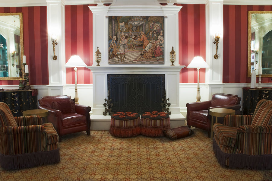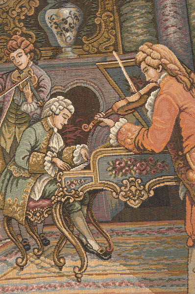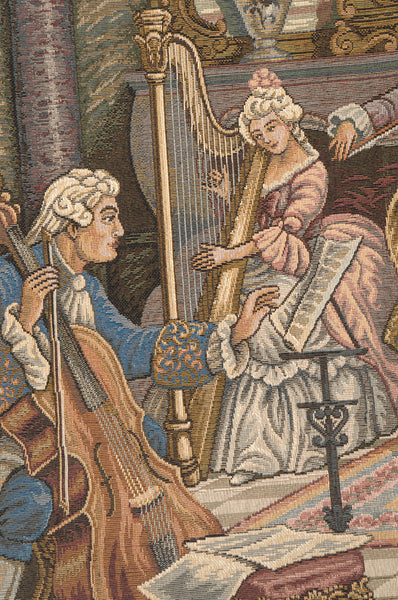 | History: | Our Concerto Piccolo Wall Art Tapestry brings the extravagant scenes of life in Louis XV’s royal court to life. Created initially by Francois Boucher, painter to the royal court, this piece exhibits all the intensity in color and detail as to his. Reflecting 18th century Rococo style art, this finely woven tapestry depicts a scene of courtiers playing musical instruments in a palace concert hall. The tapestry is woven in viscose and cotton for luxurious color and texture. Backed with lining and tunnel for easy hanging. Woven in Italy. |