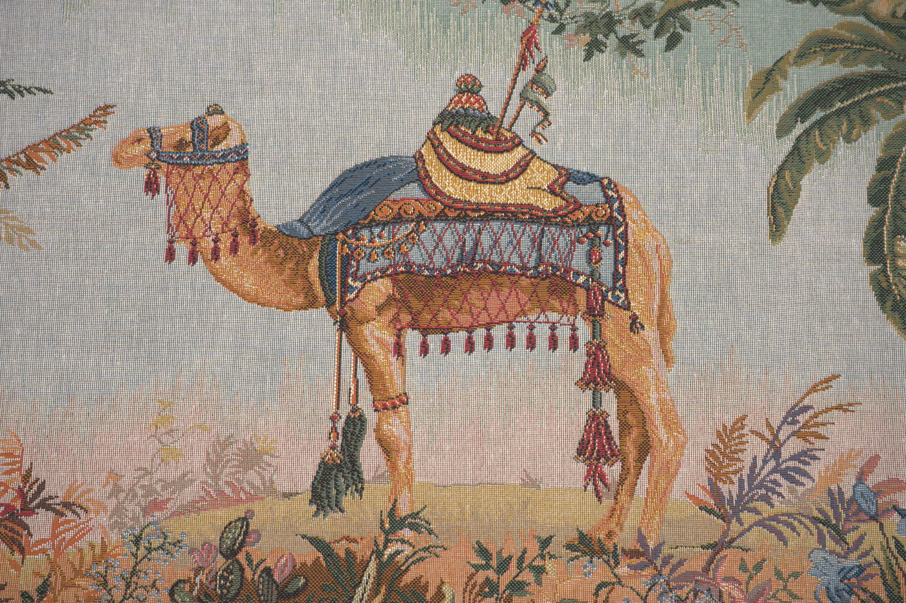 | History: | This French impressionist jacquard woven tapestry wall hanging; The Camel, or Dromadaire, depicts a camel covered with rich carpets, ornaments, and surrounded by jungle. It is inspired by The Royal Elephant tapestry that resides at the Louvre Museum in Paris. This type of exotic subject matter was popular in the Orientalism period. This luxurious piece is perfect to add to your home decor design. |