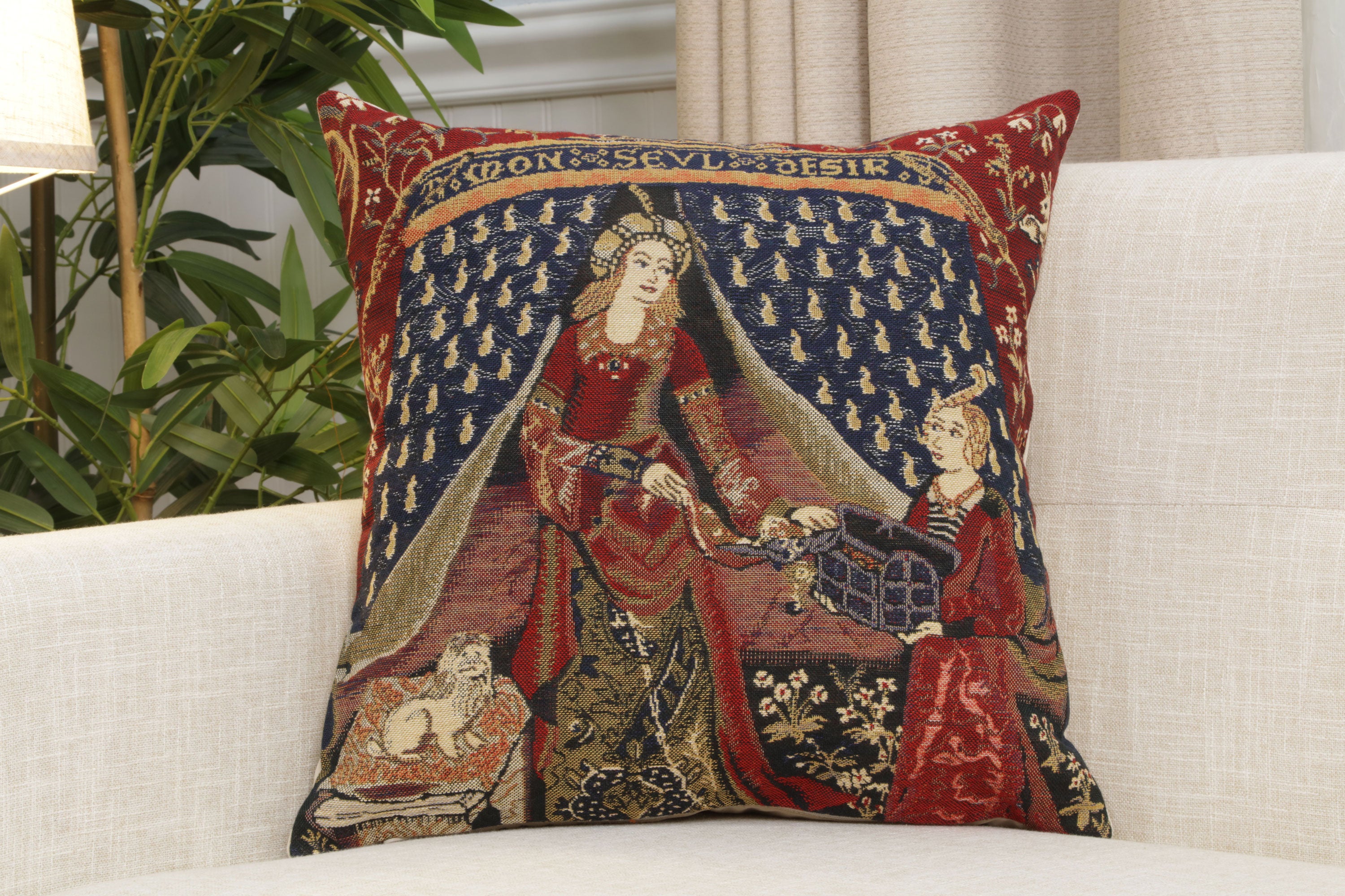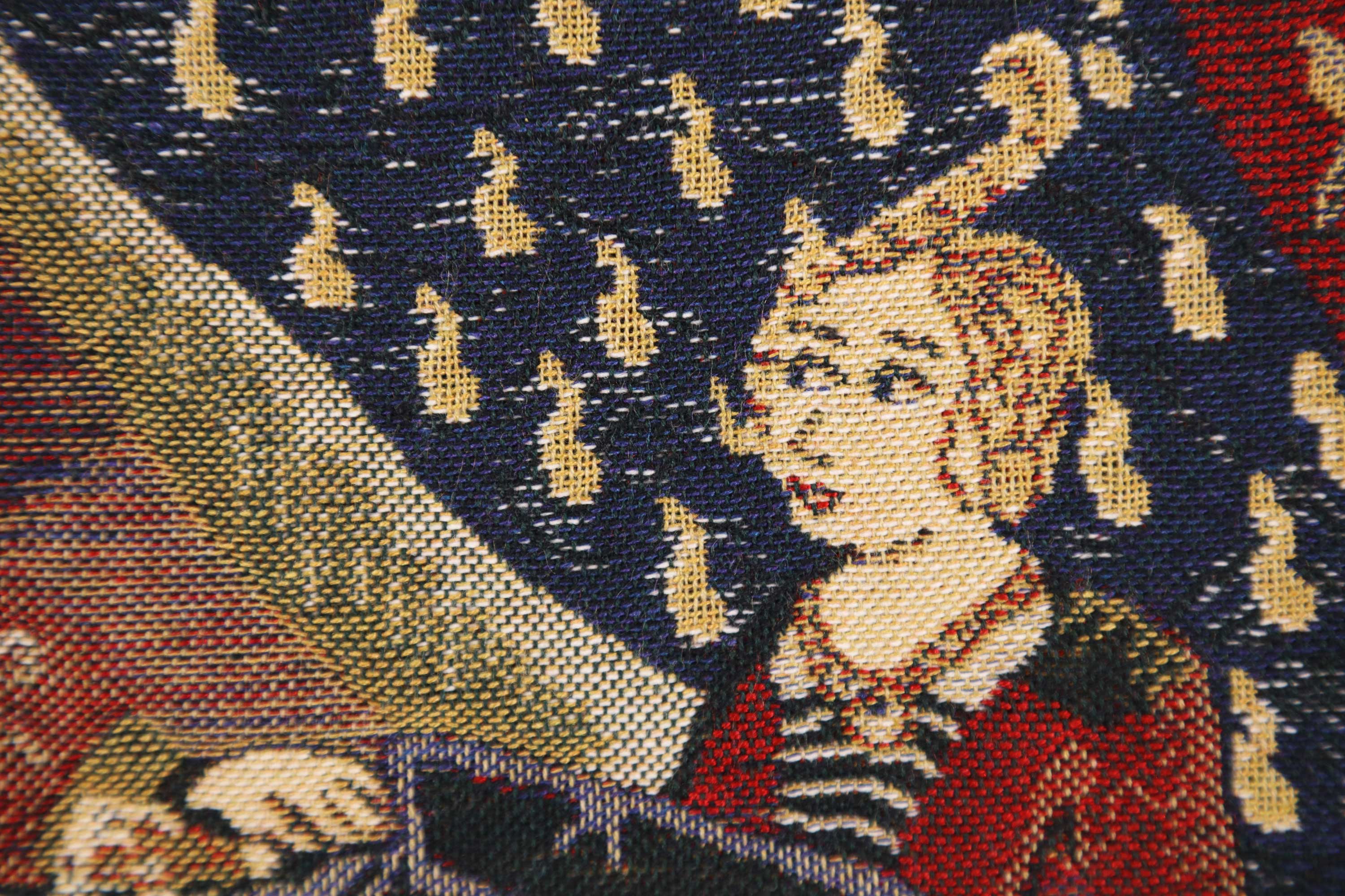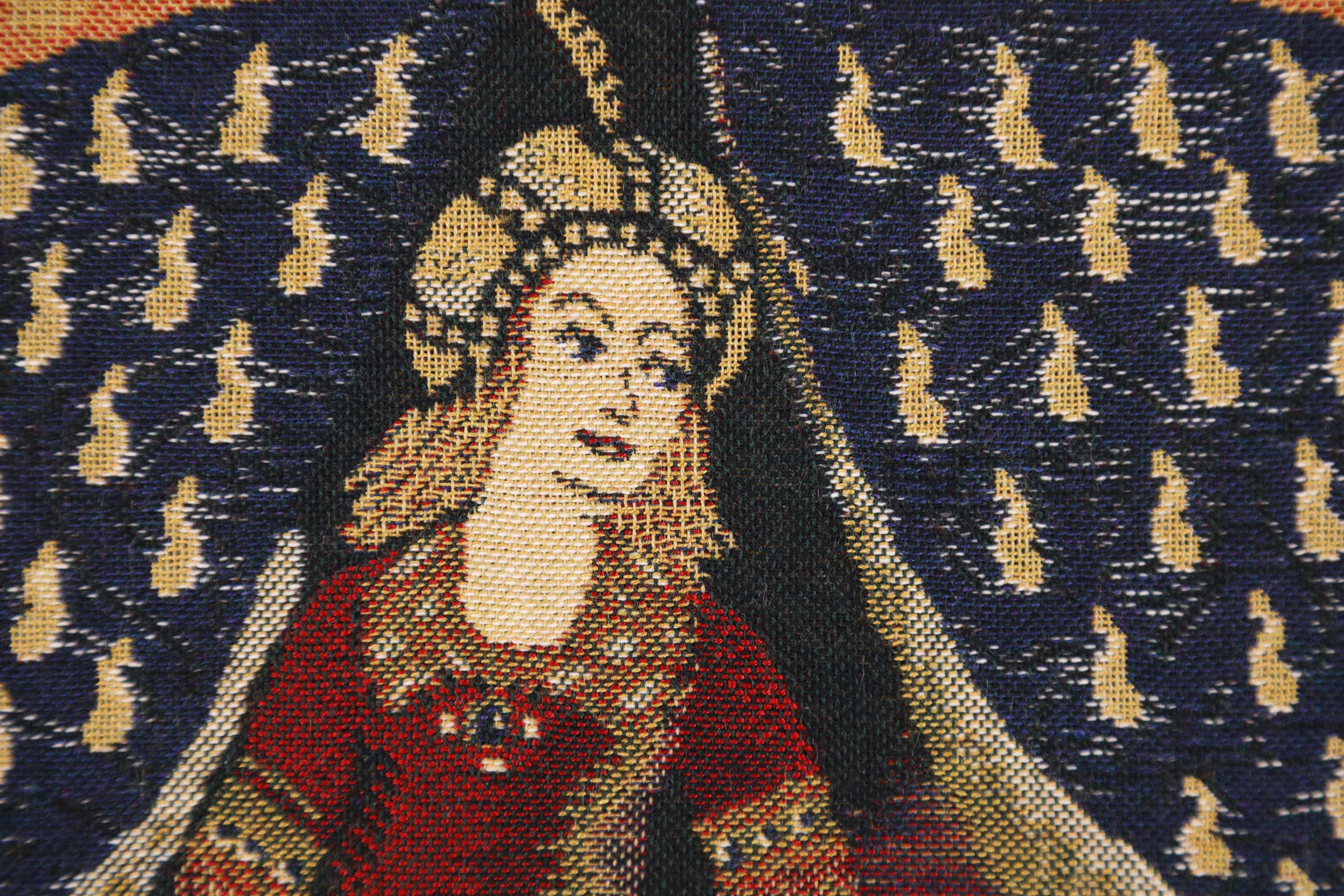 | History: | Lady and the Unicorn Belgian tapestry is one of many in the "Lady and the Unicorn" (La Dame A La Licorne) series. The lady stands in front of a tent, across the top which reads "A Mon Seul Désir" (To my only desire). Her maidservant stands to the right, holding open a chest. The lady is placing the necklace she wears in the other tapestries into the chest. To her left is a low bench with bags of coins on it. The unicorn and the lion stand in their normal spots framing the lady while holding onto the pennants. This tapestry has elicited a number of interpretations. One interpretation sees the lady putting the necklace into the chest as a renunciation of the passions aroused by the other senses, and as an assertion of her free will. Another sees the tapestry as representing a sixth sense of understanding. Other various interpretations see the tapestry as representing love or virginity. |