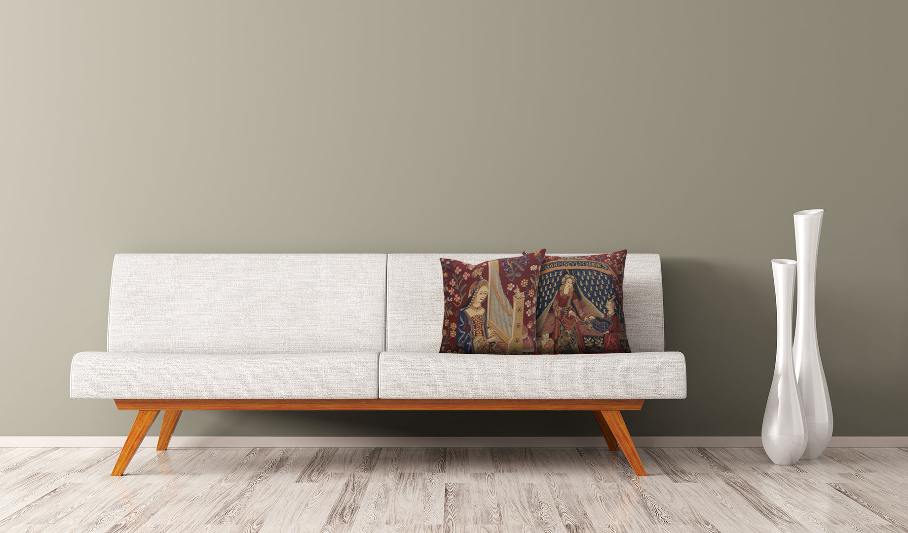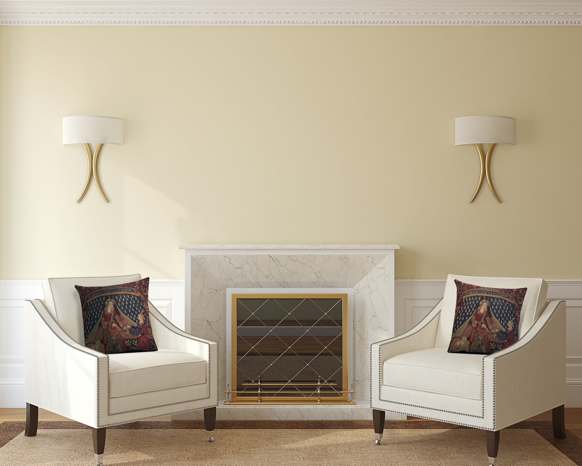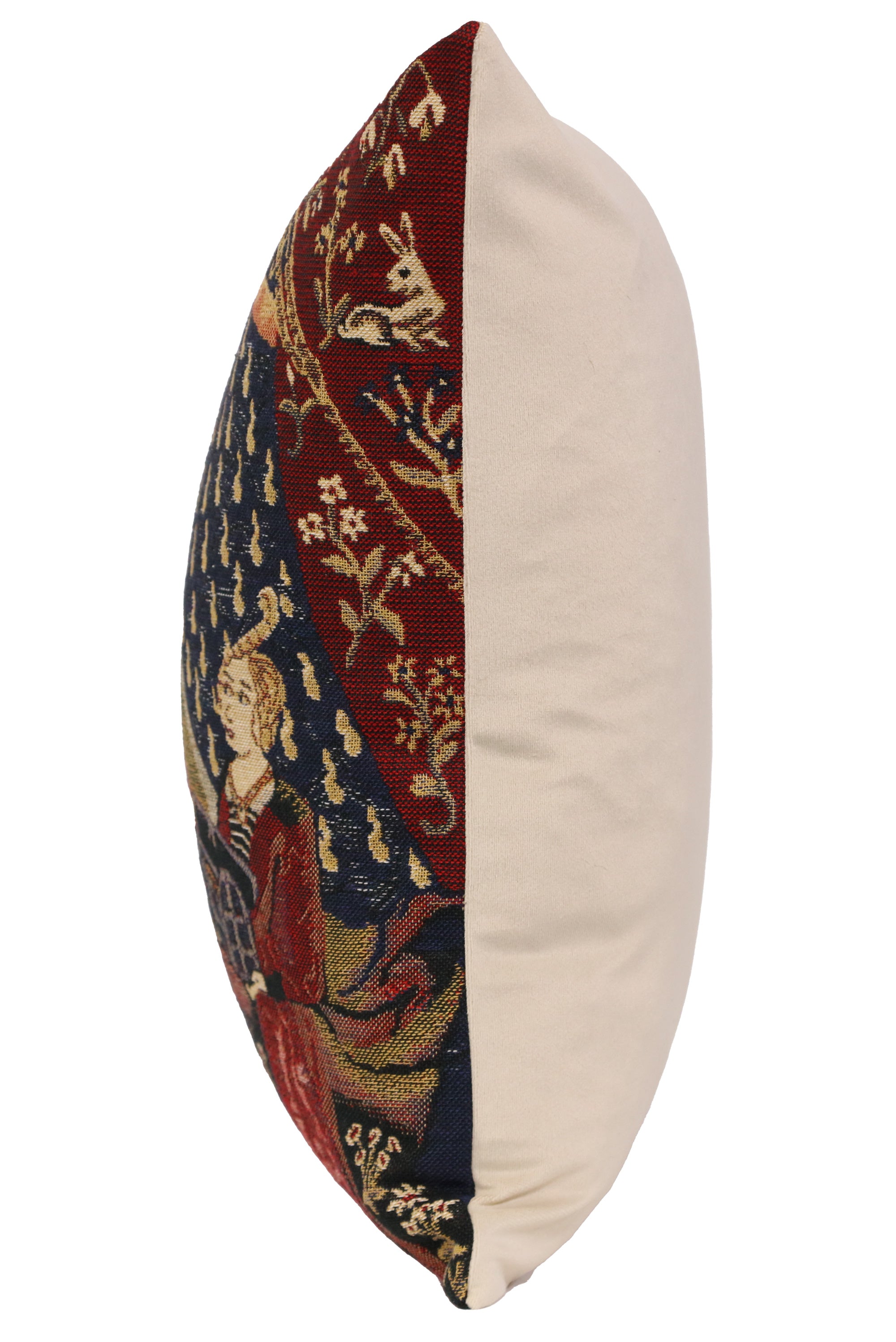 | History: | Lady and the Unicorn Belgian tapestry is one of many in the "Lady and the Unicorn" (La Dame A La Licorne) series. The lady stands in front of a tent, across the top which reads "A Mon Seul Désir" (To my only desire). Her maidservant stands to the right, holding open a chest. The lady is placing the necklace she wears in the other tapestries into the chest. To her left is a low bench with bags of coins on it. The unicorn and the lion stand in their normal spots framing the lady while holding onto the pennants. This tapestry has elicited a number of interpretations. One interpretation sees the lady putting the necklace into the chest as a renunciation of the passions aroused by the other senses, and as an assertion of her free will. Another sees the tapestry as representing a sixth sense of understanding. Other various interpretations see the tapestry as representing love or virginity. |