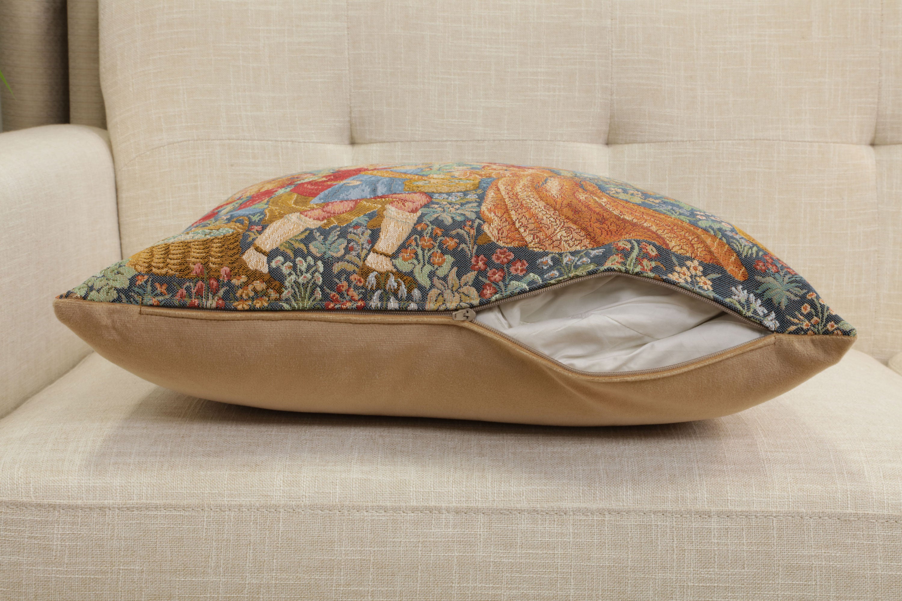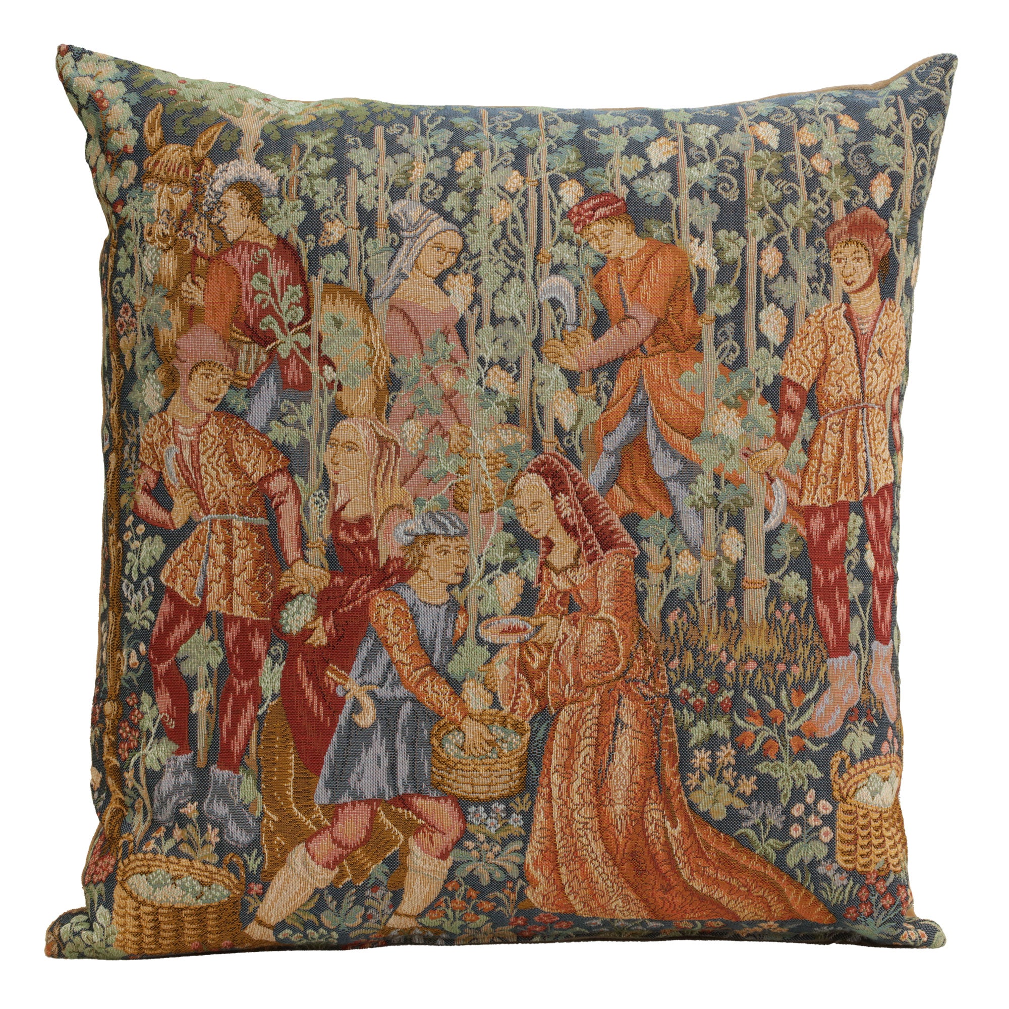| History: | This European jacquard woven tapestry cushion cover, Wine Making, or la cueillette, is an extract from the famous tapestry of the harvest of the Cluny museum, woven in Flanders at the end of the 15th century. The scene shows men and women harvesting grapes. |