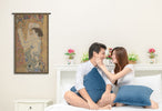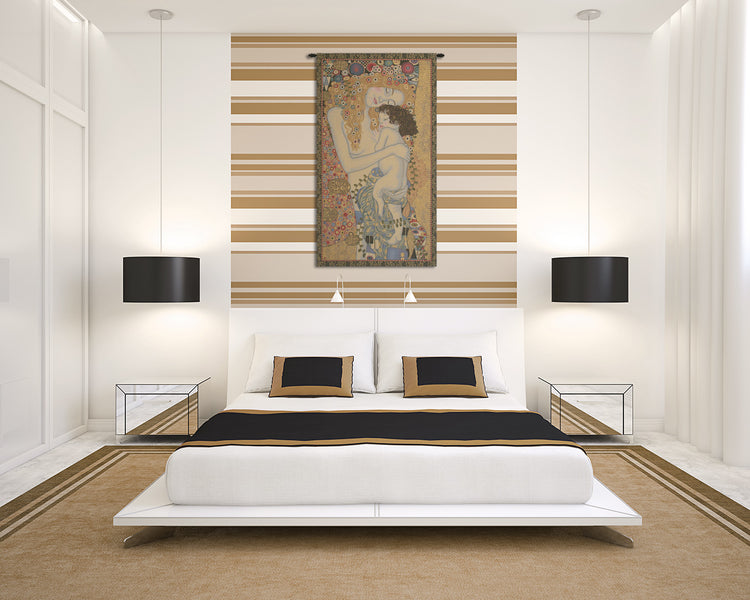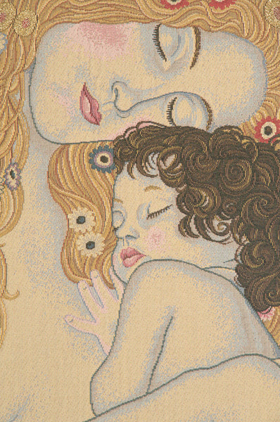 | History: | 3 Ages - Klimt is a European jacquard wall hanging. The artwork is an extract from The Three Ages of Women, painted by Gustav Klimt in 1905. He was a brilliant Austrian iconoclast who rose from childhood impoverishment to become an artist who enormously impacted the Viennese Secession and Art Nouveau movement. Known for elaborate, explicitly sensual paintings and murals, Klimt’s works also encompass themes of regeneration, love and death. Embedding his work with images symbolizing the freedom of art from traditional Western culture, Klimt’s eclectic range of influences included Egyptian, Classical Greek, Byzantine and Medieval styles. A forerunner of Modernism and the Art Deco movements, Klimt’s huge creative influence still resonates in modern art, decorations and jewelry. |