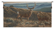 | History: | A Moment in Time tapestry features a scene with a large antlered deer and a smaller deer standing among the brush with mountains in the background. |