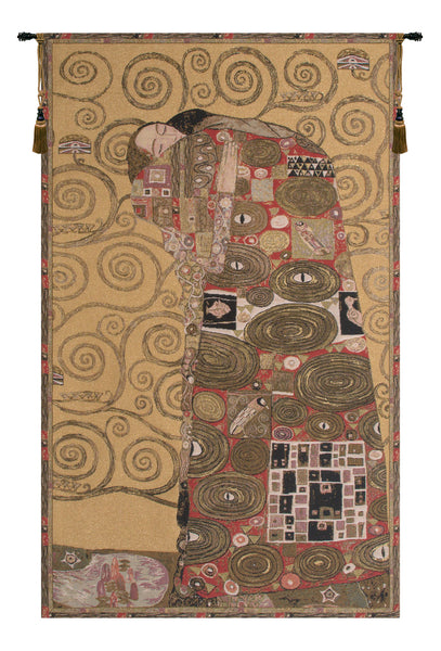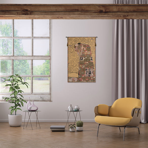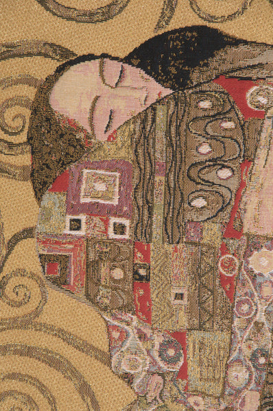| History: | Accomplissement by Klimt II is a Belgian made jacquard woven wall tapestry. It is a reproduction from Gustav Klimt, an Austrian artist (1862 - 1918). Woven on a cream and golden background in cotton and lurex, this work of art is the right part of the painting called The Plank of Stoclet (1905 - 1909). This plank is made up of three parts: The Waiting, The Tree of Life, and The Accomplishment. |