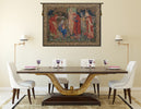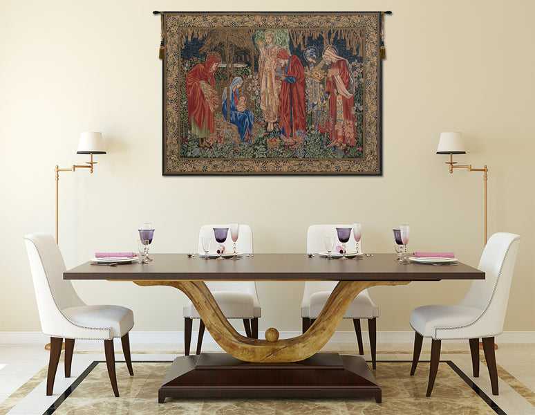 | History: | Our Adoration of the Magi I Tapestry echoes the original piece by Edward Burne-Jones and William Morris and now hanging in the Ufizzi Gallery in Florence, Italy. The original tapestry was created in 1886 with colors that were intended to be “both harmonious and powerful.” Our rendition mimics the colors and composition beautifully depicting the biblical story of the Three Kings who were guided to the newborn Jesus and Mother Mary by the star of Bethlehem. You’ll love the revered beauty and meaning this historical tapestry brings to your home. It’s wonderful as a seasonal decoration of gift for family or loved one. Our tapestry is woven in a cotton/viscose/polyester blend. Lined back and tunneled top for ease of installation. Imported from Belgium. |