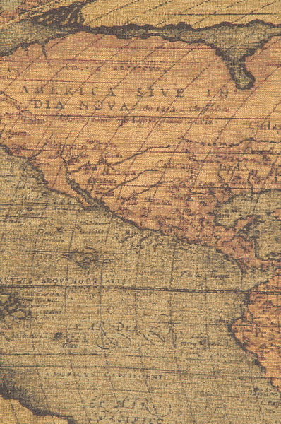 | History: | Antique Map Belgian chenille tapestry is also known as Typus orbis terrarum and features a gorgeous world map by Orterlius. In 1570, Abraham Ortelius published his groundbreaking “Theatrum Orbis Terrarum” (Theatre of the World), the first comprehensive modern atlas. Containing 53 full color maps, the atlas was an instant hit with scholars, navigators, explorers and the nobility. Of course, “Theatrum Orbis Terrarum” made Orterlius famous and he became renowned as one of the best map makers during his lifetime, which lasted from 1527 to 1598. Not bad for someone who had originally started out as an ordinary businessman. Thankfully, he met up with Flemish cartographer Gerardus Mercator and the rest is history. This wonderful reproduction of Ortelius’ world map, “Typus orbis terrarum”, a plate taken from his great work, is faithful to the original in every detail, including the colors. In “Typus orbis terrarum”, we see that most of the world’s land contours have been rendered quite accurately, even for its time. |