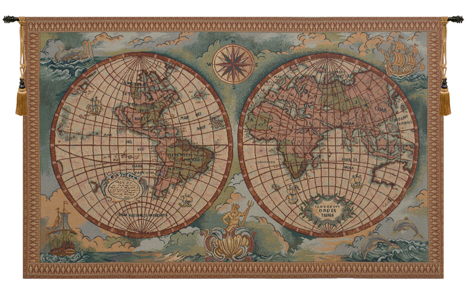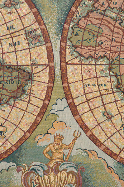 | History: | Reminiscent of the antique map displayed in German geographer and scholar Johann Hubner’s Conversations: Lexicon, de Religionen, 1777, our Antique Map I Tapestry captures all the mystery and beauty of the work of early cartographers. This intricate map features the intrigue of the sea with two large globes surrounded by elements of the water. Other smaller depictions in the four corners and upper and lower middle include a spouting whale, swimming school of dolphins, two ships with their voyages underway, and King Poseidon wielding his golden triton. The colors used to weave this tapestry are earthy in green, burgundy, gold, and blue. This antique map tapestry with border makes a studious addition to the office or study. Woven in Italy, the tapestry is made from cotton, viscose and polyester for softness and subtle sheen. Lined back and tunneled top for ease of installation. |