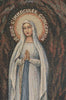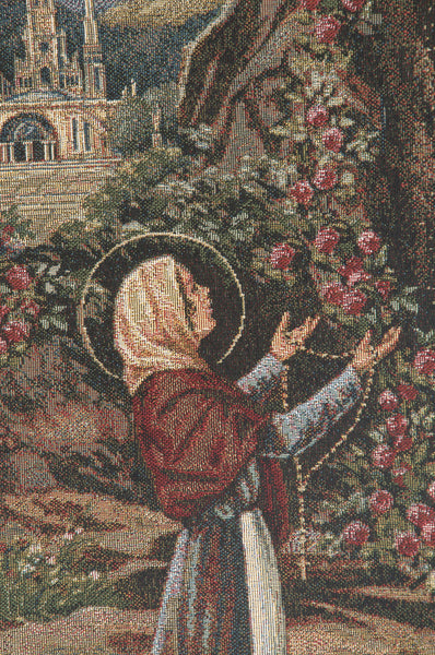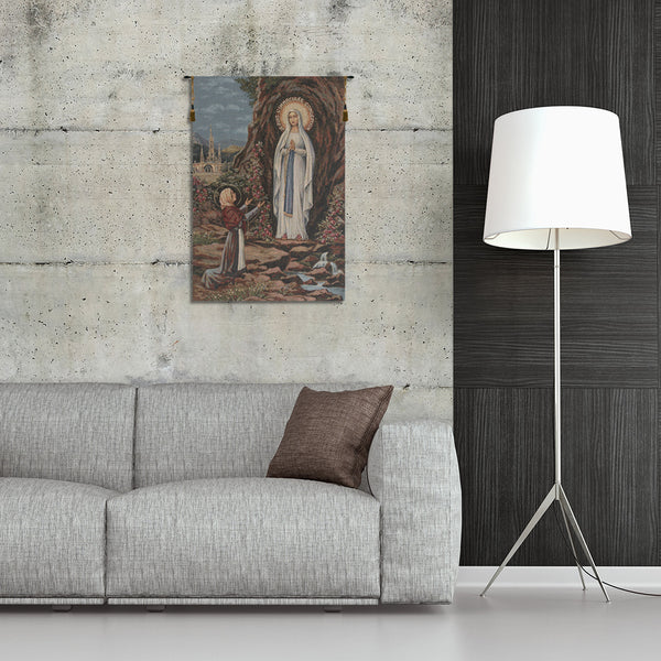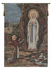 | History: | Apparitione Lourdes Italian woven tapestry features an apparition image of the Blessed Virgin Mary as described by Saint Bernadette Soubirous, a 14-year-old miller's daughter from the town of Lourdes in southern France. From February 11 to July 16, 1858, she reported 18 apparitions of "a Lady". Bernadette described the lady as wearing a white veil and a blue girdle. She had a golden rose on each foot and held a rosary of pearls. Despite initial skepticism from the Roman Catholic Church, these claims were eventually declared to be worthy of belief after a canonical investigation, and the apparition is known as Our Lady of Lourdes. According to Bernadette, her visions occurred at the grotto of Massabielle, just outside of Lourdes. On July 16, 1858, Bernadette visited the grotto for the last time and said "I have never seen her so beautiful before." On January 18, 1860, the local bishop declared that the Virgin Mary did appear indeed to Bernadette Soubirous. In 1958, Pope Pius XII issued the encyclical Le pèlerinage de Lourdes (French, The pilgrimage to Lourdes) on the 100th anniversary of the apparitions. Pope John Paul II visited Lourdes three times; Pope Benedict XVI visited Lourdes on September 15, 2008, to commemorate the 150th anniversary of the apparitions. |