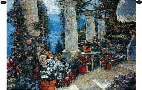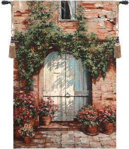 | History: | Back Porch Gathering tapestry features the back porch of a large, well used victorian style home. On the porch we see a line of old wooden rocking chairs in different sizes. |