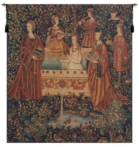 | History: | This Belgian wall tapestry, Bain, or the Bath, is a reproduction from the time of Louis XII (1462-1515). The original is exhibited at the Cluny Museum, Paris. This tapestry represents a noble lady bathing and surrounded by her ladies-in-waiting and servants. A fine accent to your home décor. |