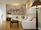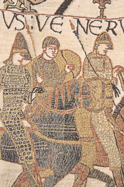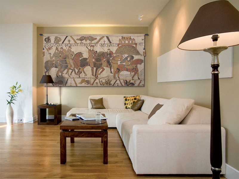 | History: | This Belgian jacquard tapestry, Bayeux Mont St. Michael, is an extract of the queen Mathilde's tapestry. The original some 230 feet long, is in the Bayeux museum in Normandy. It describes how England was conquered by Normans. Also known as L'Embarquement. Here Duke William and his army come to the Mount of Michael. This piece adds an air of sophistication as it displays one of histories most historical moments. |