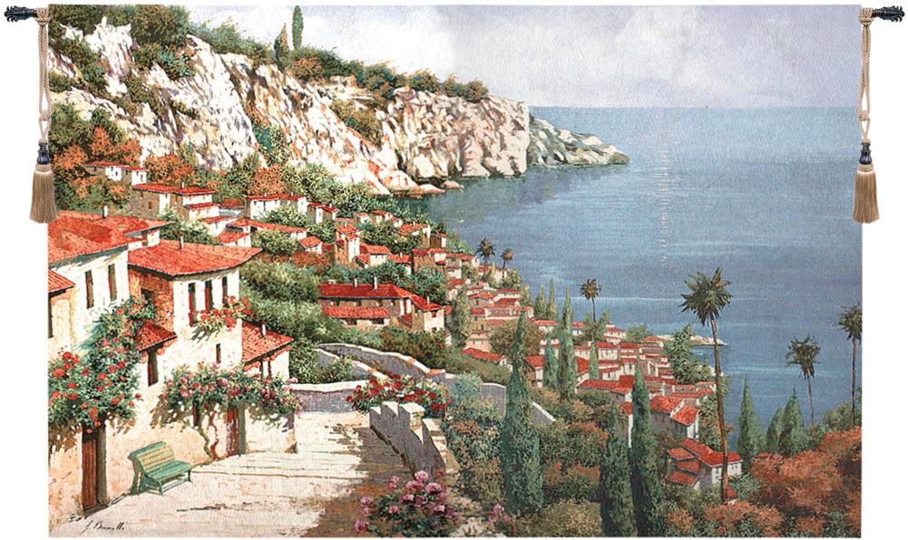 | History: | Bellagio Park tapestry will give you the feeling of being whisked away to a seaside community composed of villa style homes with red terra cotta roofs on the bright blue water's edge. |