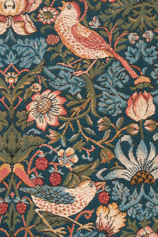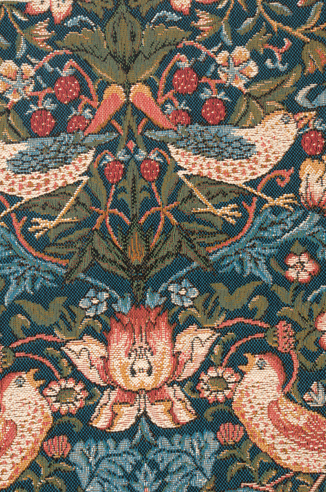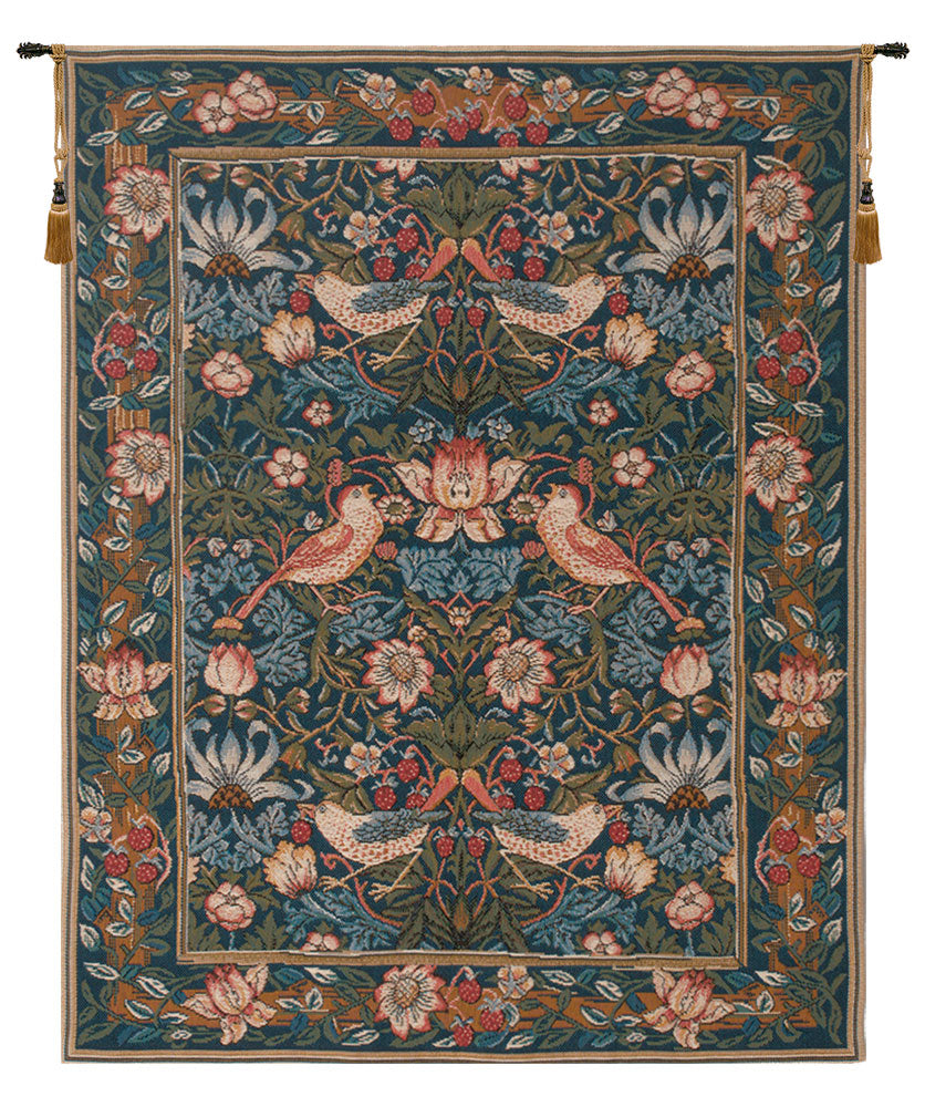 | History: | Birds Face to Face I transports you to a universe filled with lush vegetation and colorful animals. This jacquard wall art tapestry is based on a William Morris work, entitled Strawberry Thief, 1883. One of his most popular designs: he depicts thrushes that were stealing fruit in his country home garden. William Morris, the famous English artist has designed many fabrics and tapestries of world renown many of which now reside in the world's most prestigious museums. Morris looked to the earlier era of artisanship and beauty and sought to replicate the joys of handmade fiber arts |