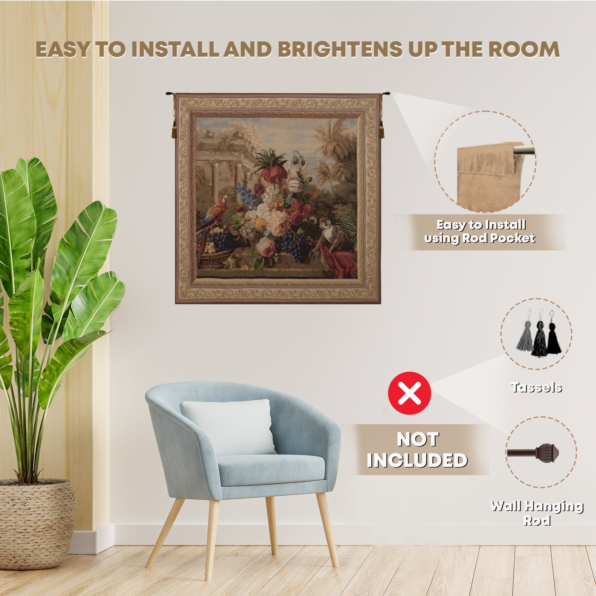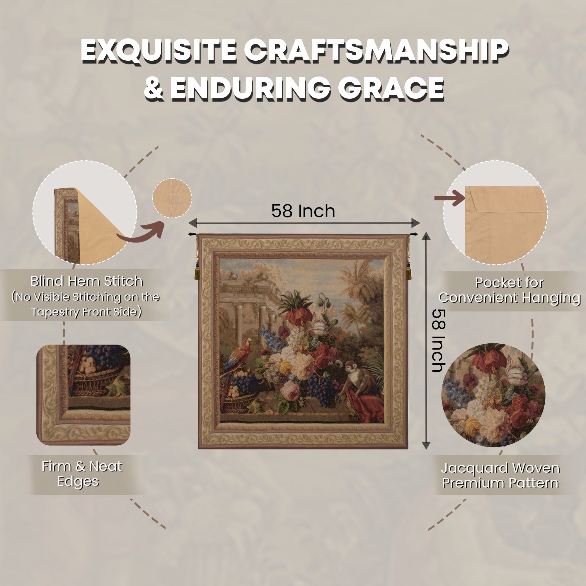| History: | Exotic Bouquet with Monkey is Inspired from the work of Jan Frans van Dael, 1764-1840, this French wall art tapestry represents a splendid bouquet of flowers, fruit, a parrot, and a monkey. The background scene consists of exotic ruins and tropical trees and all is surrounded by a arabesque border. Also known as Bouquet Exotique with Monkey. |