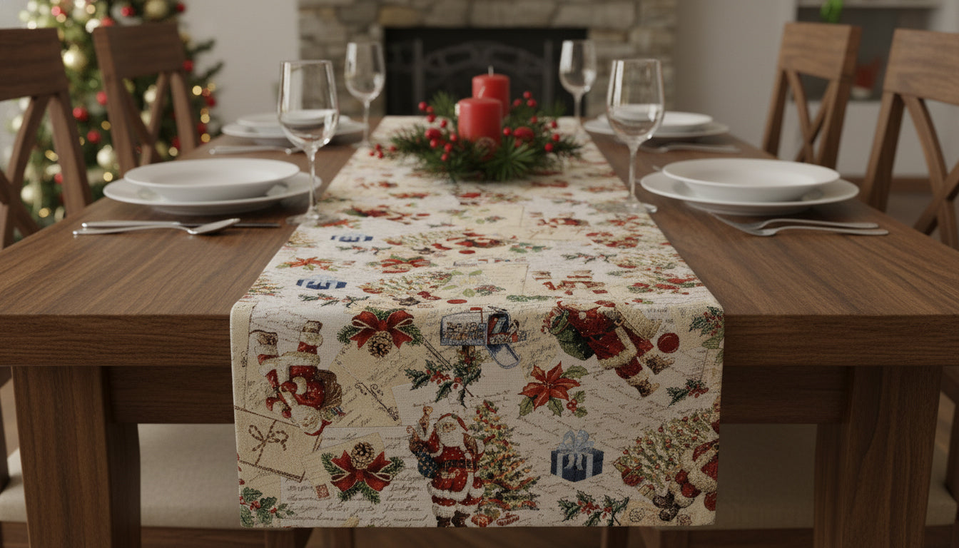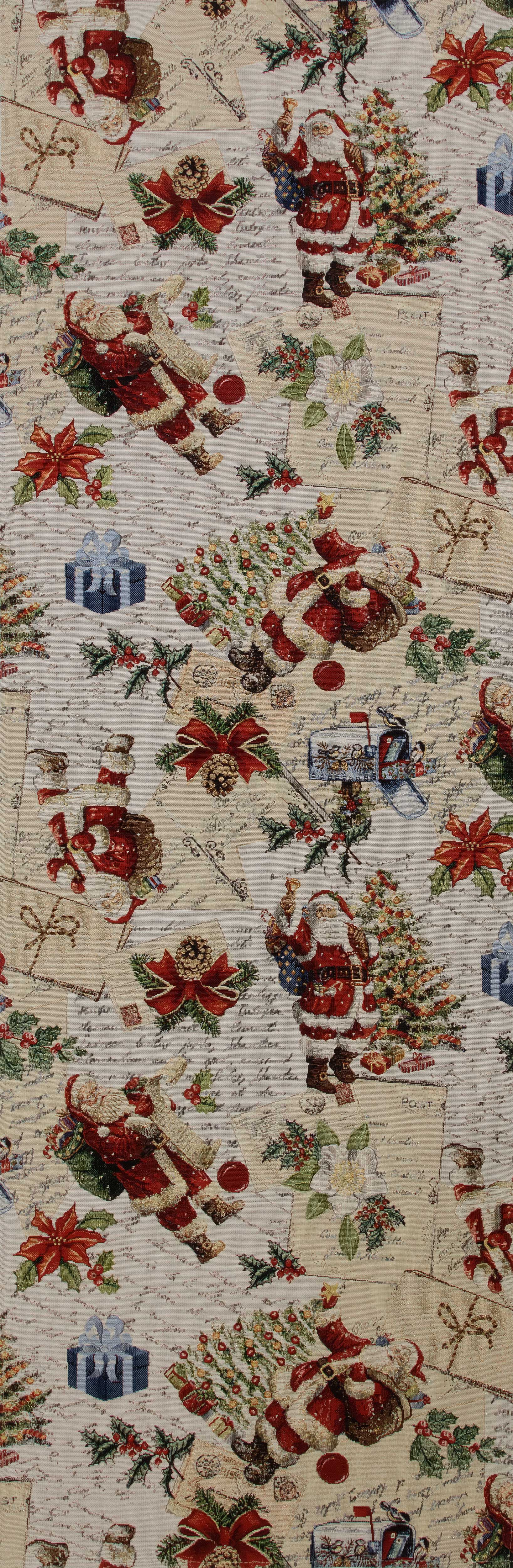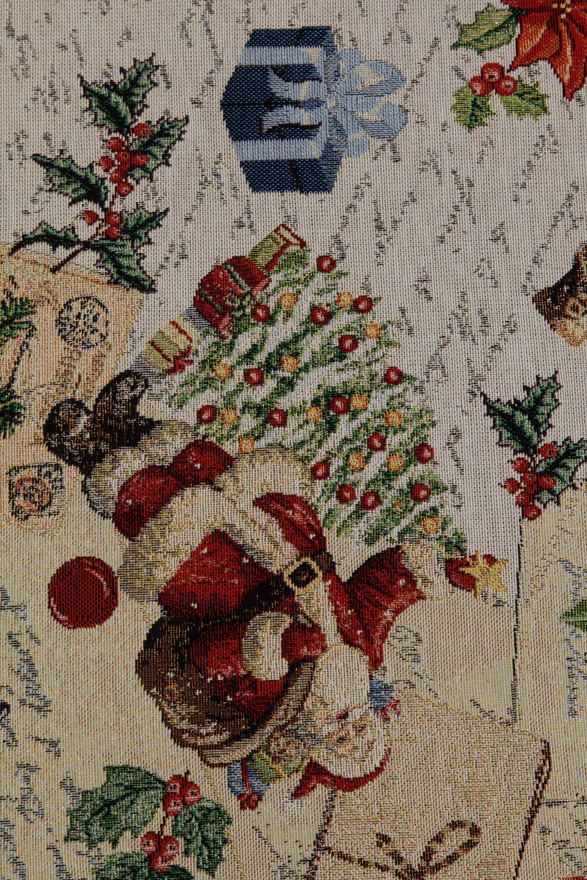 | History: | Infuse your table with holiday spirit using the Celeste series Christmas home décor. This elegantly designed table runner features a multi-directional pattern showcasing Santa Claus, gift-filled mailboxes, presents with bows, holly leaves, and Christmas trees. Interwoven gold threads add a festive sparkle, enhancing the celebratory essence of Christmas. This heartwarming décor brings elegance to your holiday dining experience, transforming your table into a centerpiece of joy and tradition. Celebrate the season with this delightful addition, making every meal a festive occasion. |