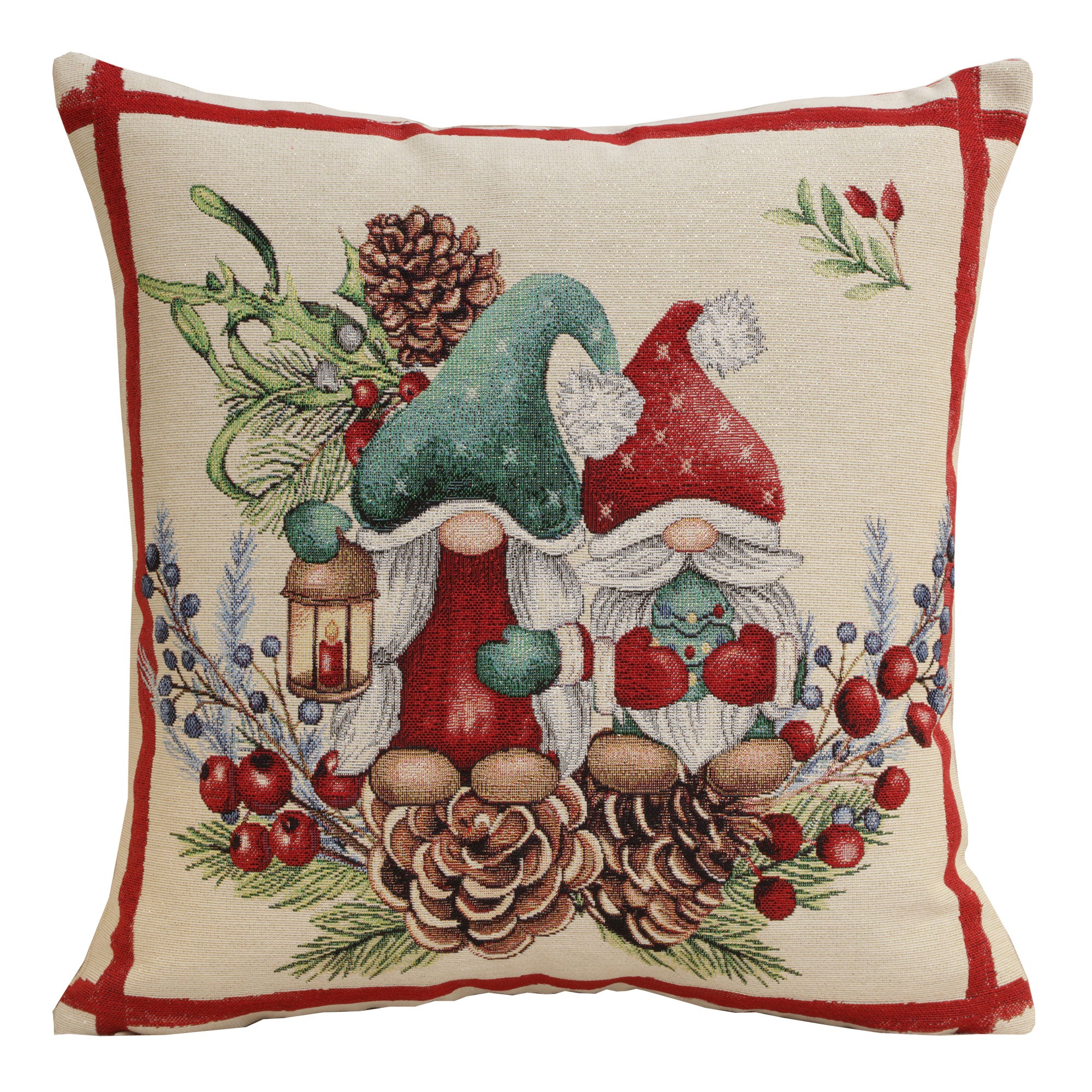 | History: | Add holiday spirit to your home with the Charity series Christmas home décor. This elegantly designed, double-sided cushion cover features two charming Christmas gnomes amidst pinecones, winter berries, evergreen boughs, and holly leaves, all framed by a red border. Interwoven gold threads add a festive sparkle, enhancing the celebratory feel. This heartwarming décor brings elegance to your holiday living space, transforming your home into a joyful retreat. Celebrate the season with this delightful addition, making every moment a festive occasion. |