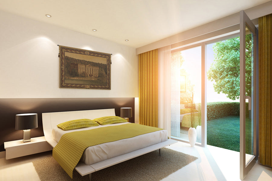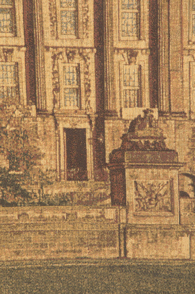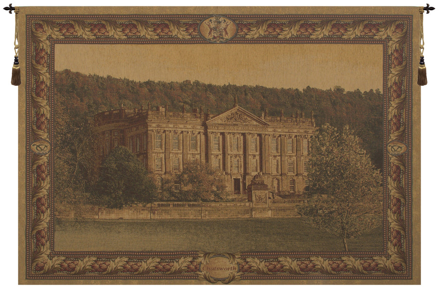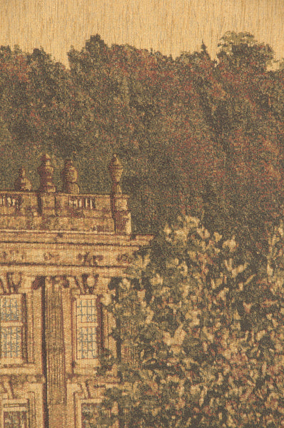 | History: | Chatsworth Castle Belgian chenille tapestry features the famous Chatsworth castle nestled in its lovely grounds in Derbyshire. This English castle is a wonder in that it's a treasure trove of drawings, sculpture, and priceless paintings and other artifacts. This tapestry captures the west view of the castle, which was originally built in the 1500's and since has been the home to the Dukes of Devonshire. The castle stands on the east bank of the Derwent river. Renowned for it's beautiful and elegant character and form, this castle is surrounded by some of the most beautiful countryside in England with over 1000 acres of gardens. Inside lies the 19th century Library, Great Dining Room and Sculpture Gallery and this home is much admired by visitors daily. |