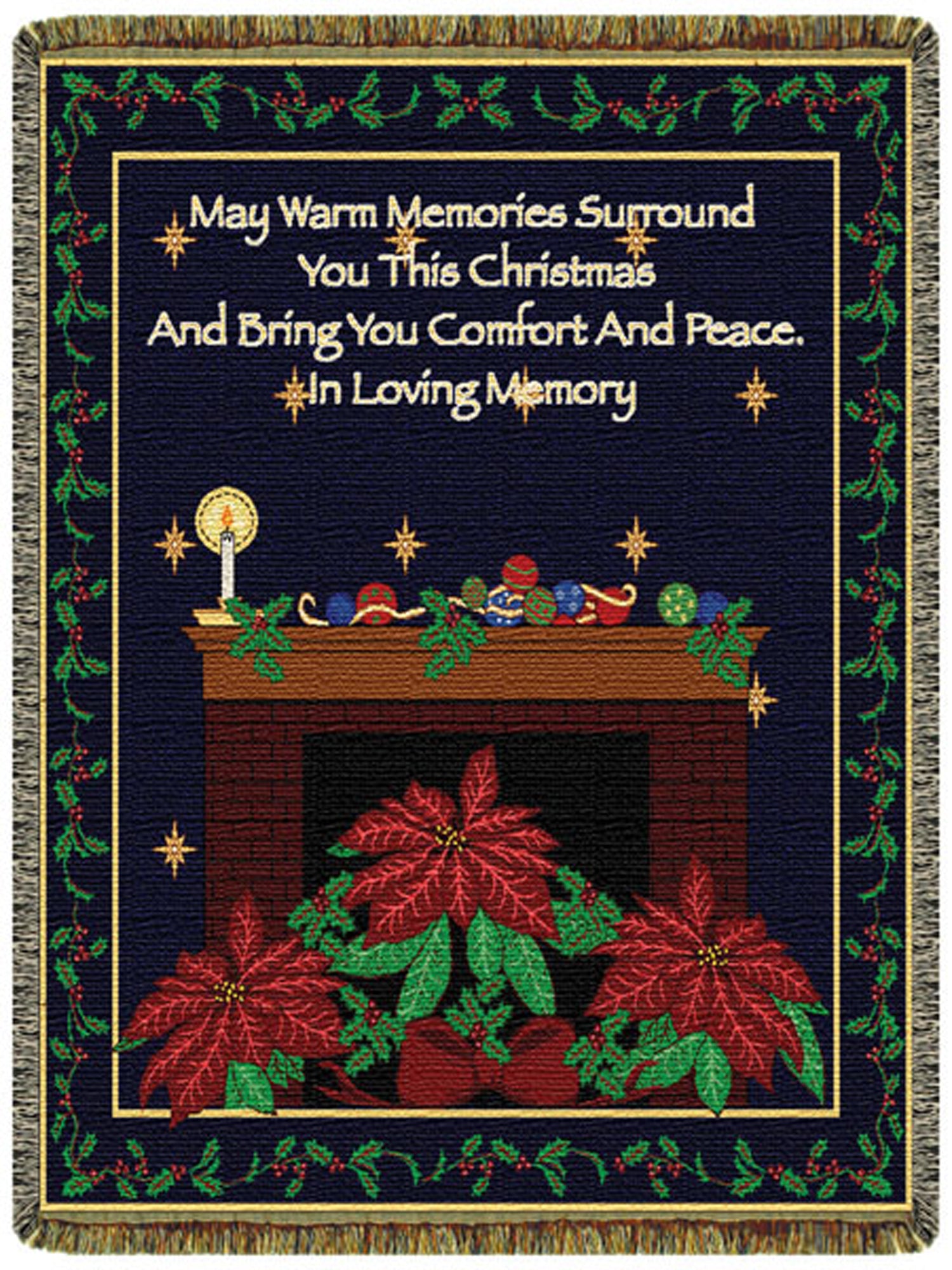 | History: | Christmas Memories North American Made Tapestry Throw Fireplace, and Poinsettia Christmas Print with Wording "May Warm Memories Surround You This Christmas and Bring You Comfort and Peace in Loving Memory" |