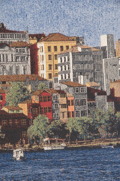 | History: | A woven bustling and full of life stretched wall tapestry depicting an energetic city dancing between the ocean and skyline. If you can't get to the ocean, bring the ocean to you with this romantic landscape of the City by the Sea . |