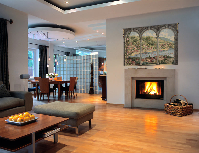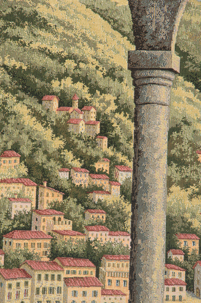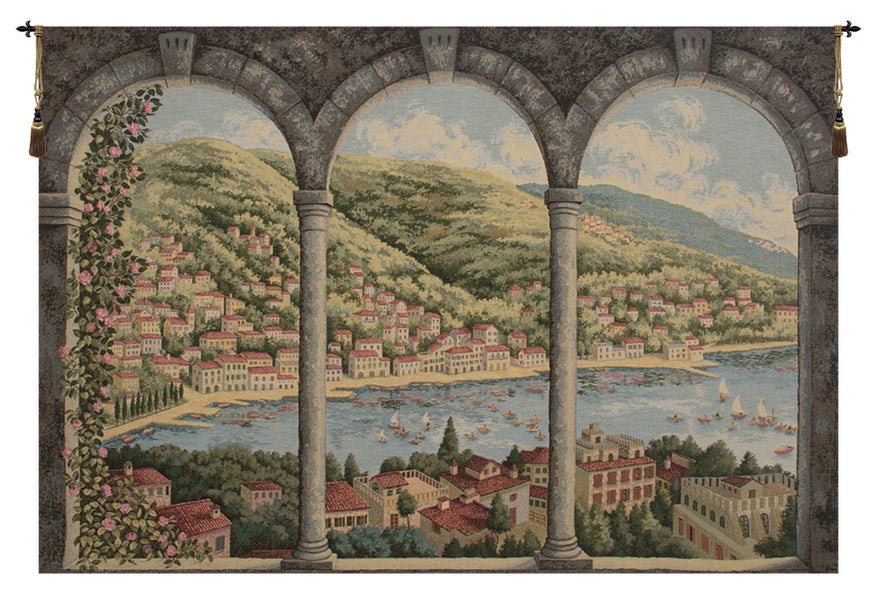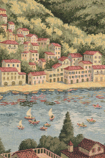 | History: | Como Lake is an Italian jacquard wall tapestry. A towering view within three stone arches of the famous region of Lake Como is displayed. We see the rolling hillsides, Italian villas, and boats in the bay on a beautiful sunny day. We are shown the idyllic life of one of the most coveted regions in Europe. The region has a mild Mediterranean climate and as such has been a favored home for centuries for aristocrats, royalty, and tourists. |