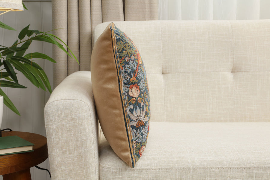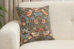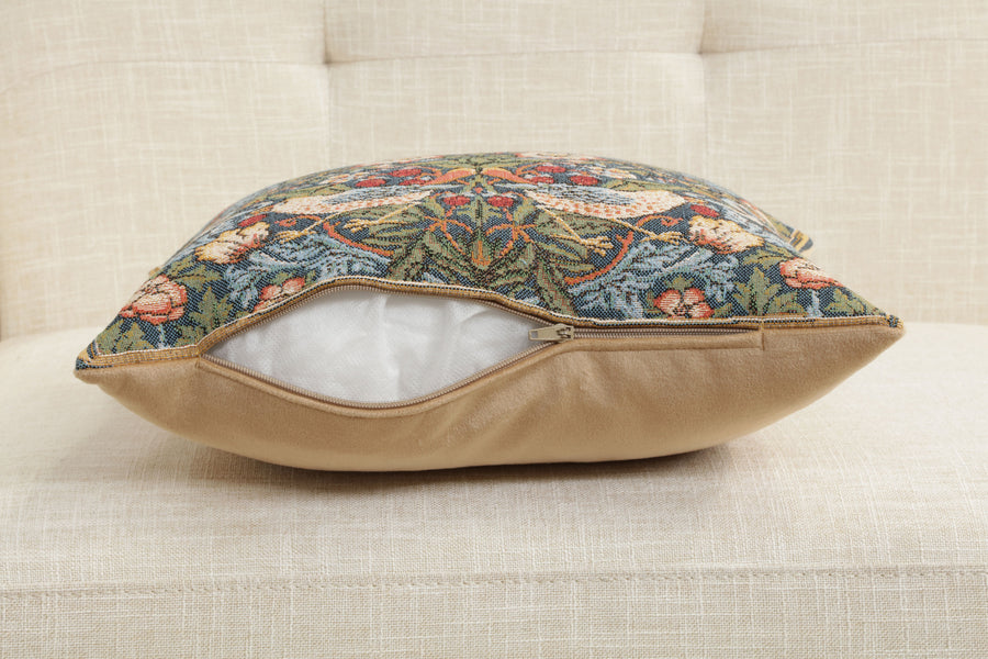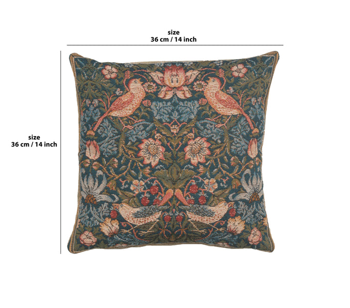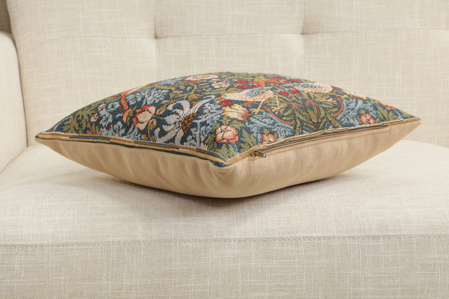 | History: | Fine art that transports you to a universe filled with lush vegetation and colourful animals. This beautiful European jacquard tapestry cushion cover is based on a William Morris work, entitled Strawberry Thief, 1883. One of his most popular designs: he depicts thrushes that were stealing fruit in his country home garden. William Morris, the famous English artist has designed many fabrics and tapestries of world renown many of which now reside in the world's most prestigious museums. Morris looked to the earlier era of artisan craft and beauty and sought to replicate the joys of handmade fiber arts. |