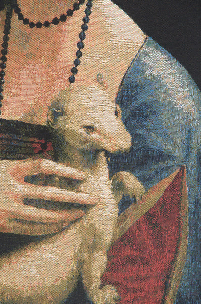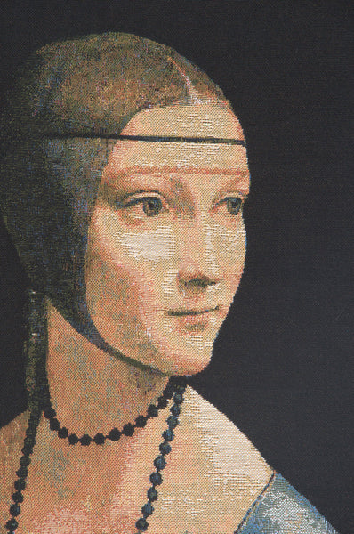 | History: | Dame A L'Hermine woven Belgian tapestry is inspired by the work of artist Leonardo Da Vinci. This piece features the Dame A L'Hermine, or The Lady with the ermine, as it is also called. The subject in the painting has been identified with reasonable certainty as Cecilia Gallerani, who was the mistress of Leonardo's employer, Ludovico Sforza. The woman is sitting body facing three quarters right but facing left as if to be looking at another person. In her arms, Gallerani holds a small white-coated stoat, known as an ermine.The ermine, a stoat in its winter coat, was a traditional symbol of purity because it was believed an ermine would face death rather than soil its white coat. In his old age, Leonardo compiled a bestiary in which he recorded: MODERATION The ermine out of moderation never eats but once a day, and it would rather let itself be captured by hunters than take refuge in a dirty lair, in order not to stain its purity. |