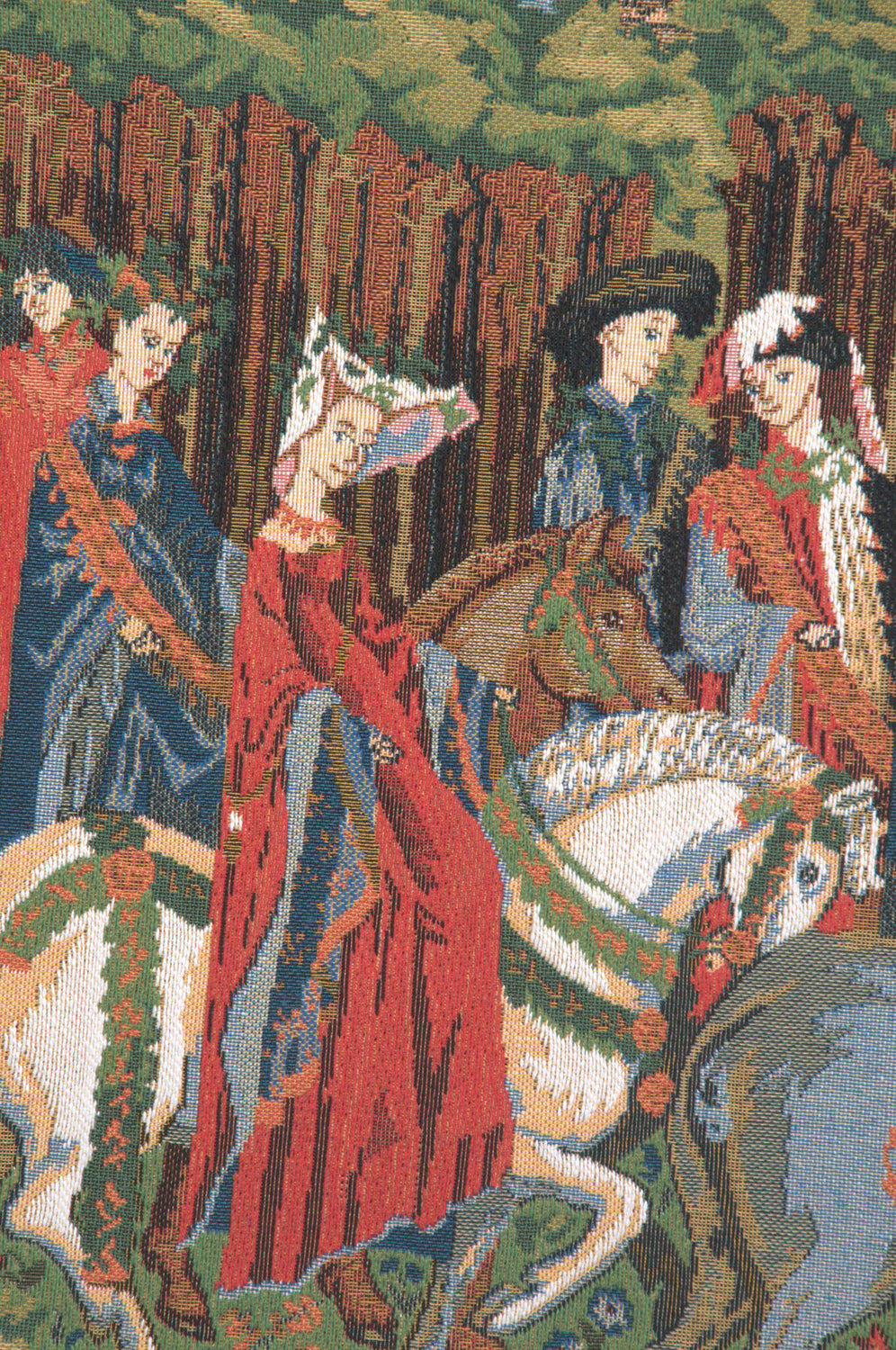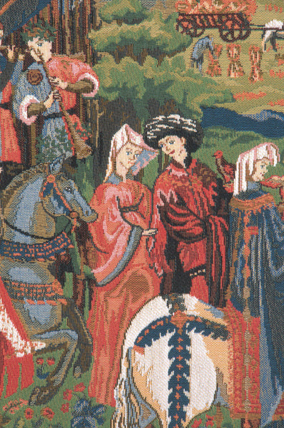 | History: | Duke of Berry, or The Falcon Hunt, is a Belgian made jacquard woven wall tapestry. The artwork comes from a design in Tres Riches Heures (Book of Hours) du Duc de Berry (1413-1416), which is one of the most famous books of French Gothic illuminated manuscript in the Middle Ages. |
