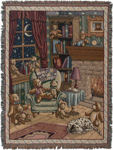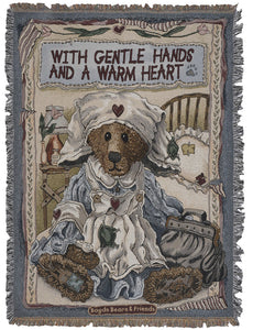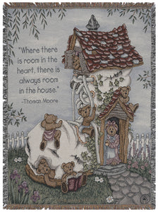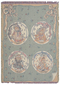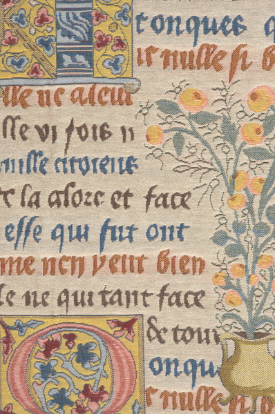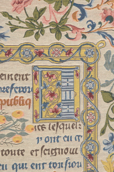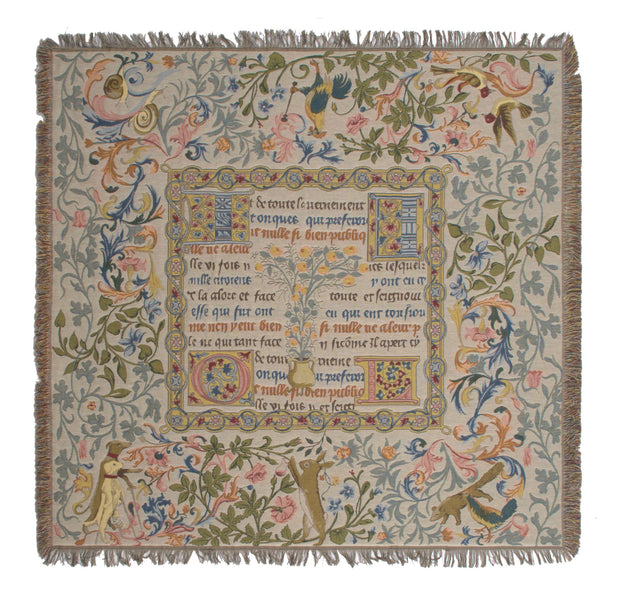 | History: | Fairy Tale I woven European throw features a floral border with birds along the outside and a yellow flower bouquet and fairy tale written in a foreign language in the center. |
