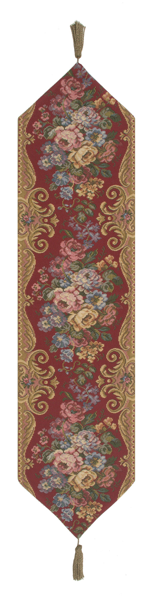 | History: | Fancy Flowers II woven European table runner features a beautiful gold fleur style border with bountiful bouquets of various flowers in all shapes and colors on each end. |