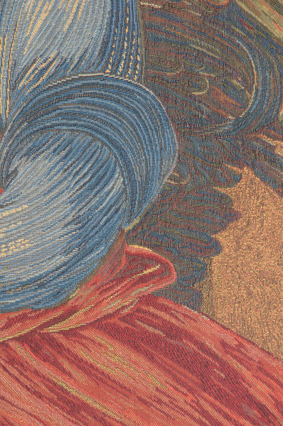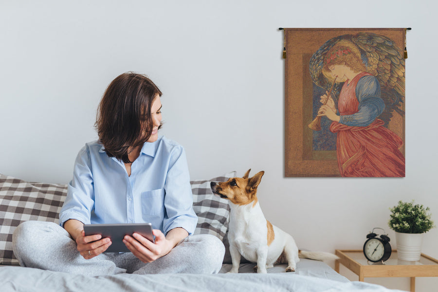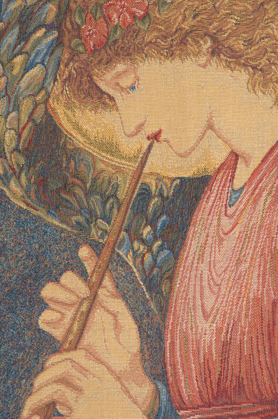 | History: | Flageolet Angel is a Belgian made jacquard woven wall tapestry. The artwork comes from a pre-raphaelic painting by Edward Burne-Jones (1878). The original is now on display in the Liverpool Museum. |