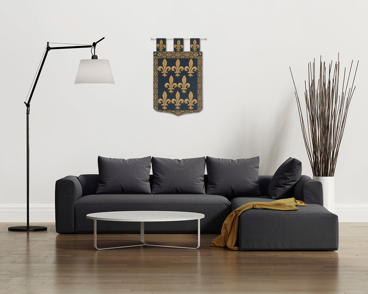 | History: | Fleur De Lys is a European jacquard wall tapestry. Also known as a fleur de lis, this symbol is particularly associated with the French monarchy. It remains an enduring symbol of France, and is still found on the Coat of Arms of many nations. |