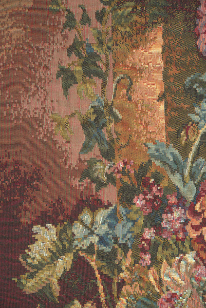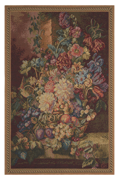 | History: | Flor Italian woven tapestry features a beautiful fruit and floral still life image. In this tapestry we see a stunning compilation of flowers and fruit bountifully grouped together among antique china dinnerware and serving pieces. |