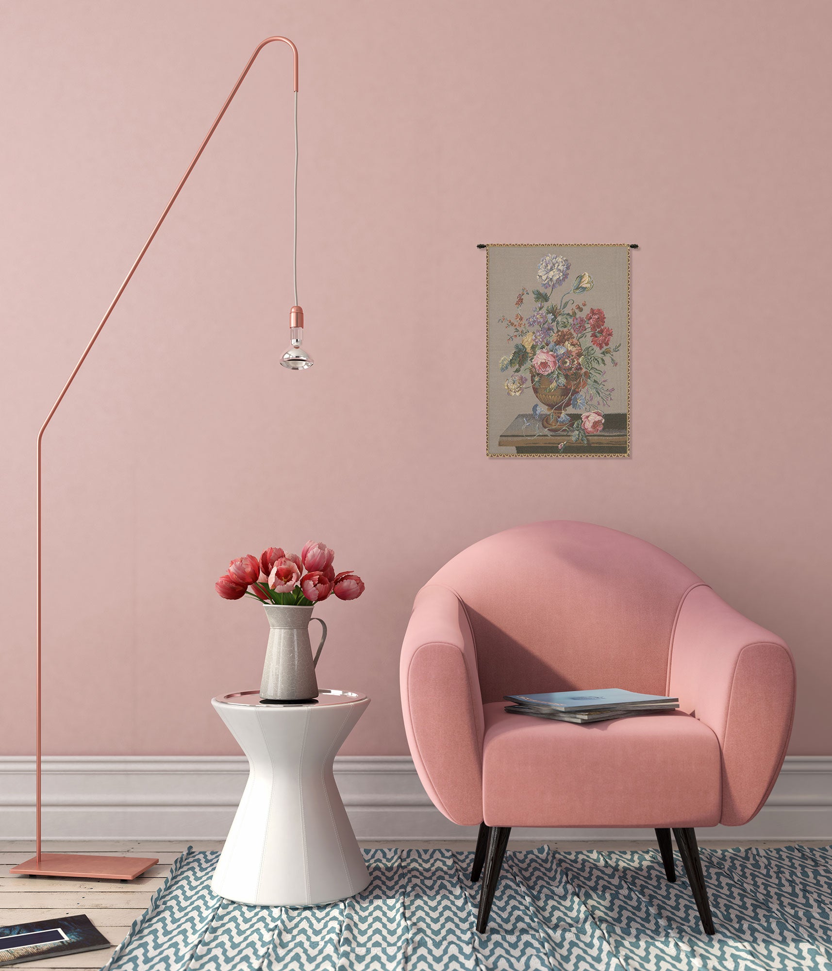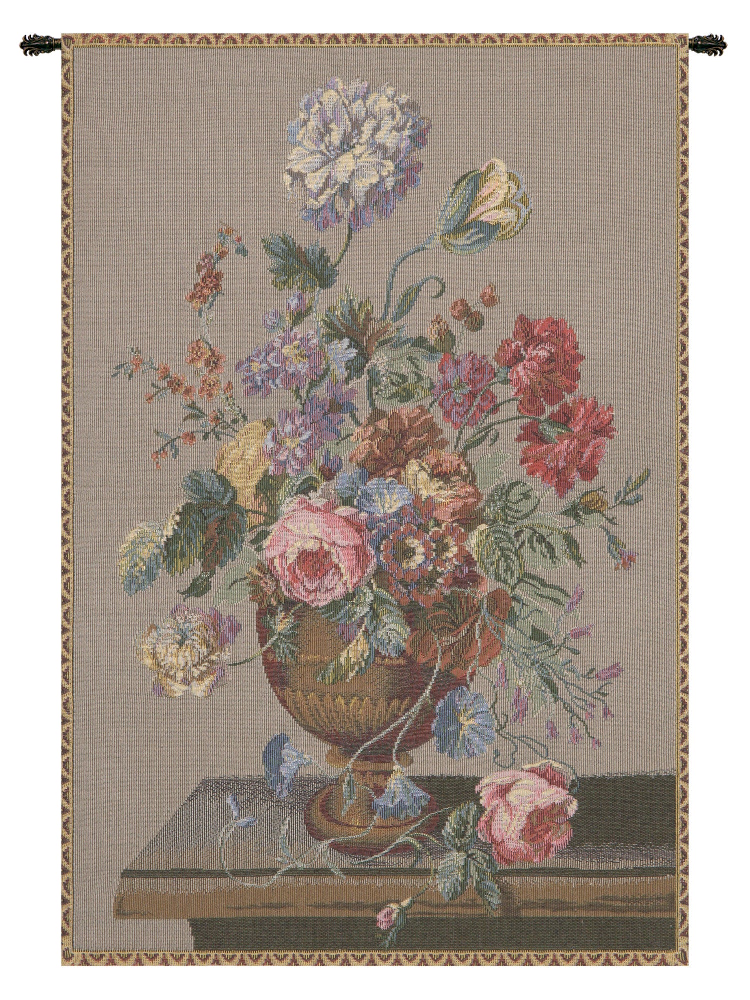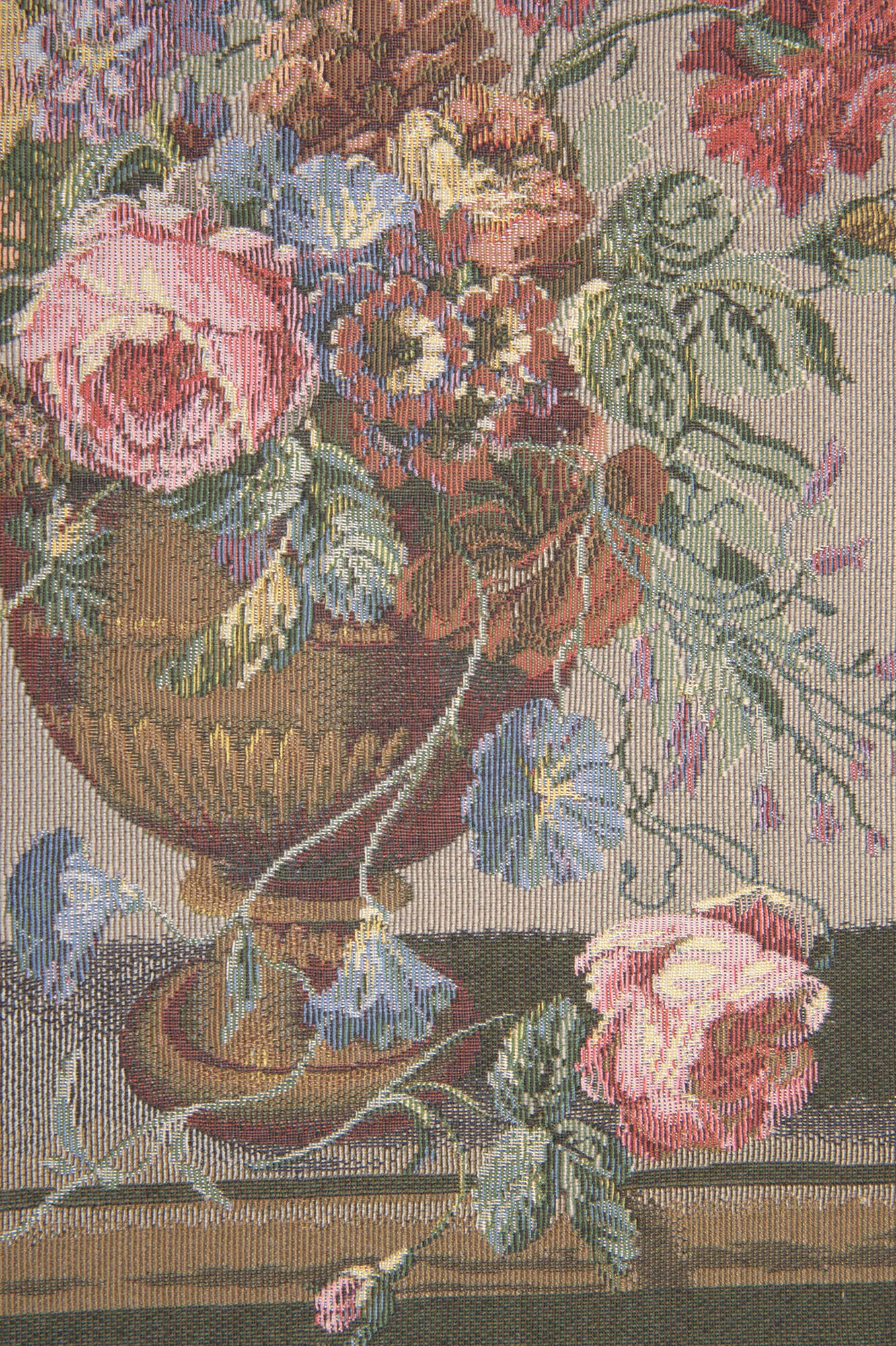 | History: | Still life is a Belgian made jacquard woven wall tapestry. This classically formal floral still life presents a vase of boldly colored flowers upon a light background and is completed with an acanthus leaf border. |