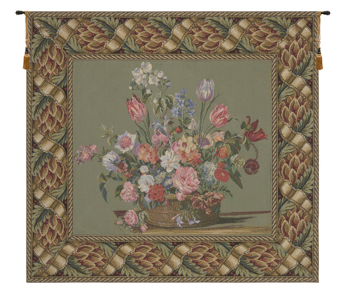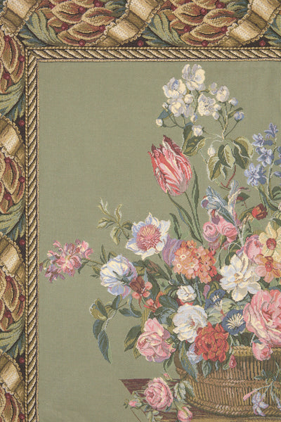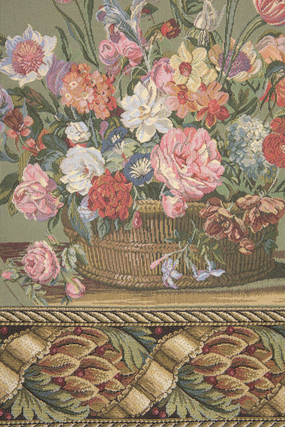 | History: | Flower Basket is a Belgian made jacquard woven wall tapestry. This floral still life makes a stunning impression, rich in color and detail. A light background behind a lovely arrangement of boldly colored flowers creates a classic look. |