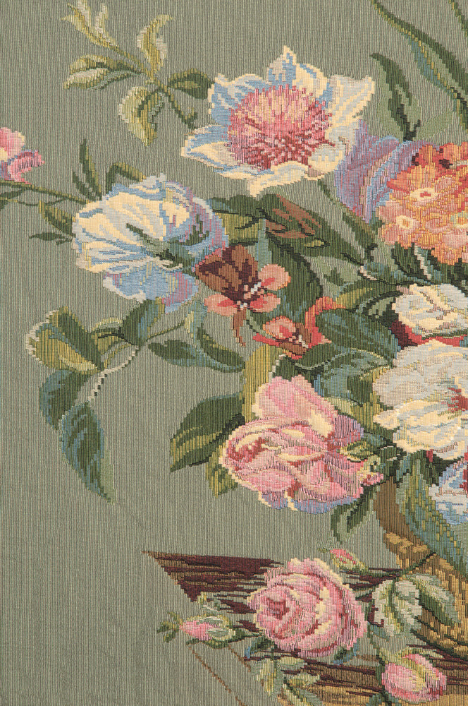| History: | Flower Basket is a Belgian made jacquard woven wall tapestry. This floral still life makes a stunning impression, rich in color and detail. A light background behind a lovely arrangement of boldly colored flowers creates a classic look. |