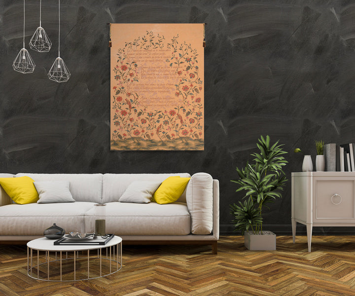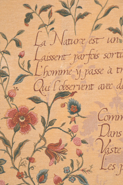 | History: | French Poem and Birds Belgian chenille tapestry features flowers and exotic birds sitting in a tree surrounding a beautiful poem written in French. This decorative piece shows the beauty of classic styled Belgian floral decorative works where flowers and birds are used to create a fantasy scene to celebrate the beauty of nature. |