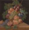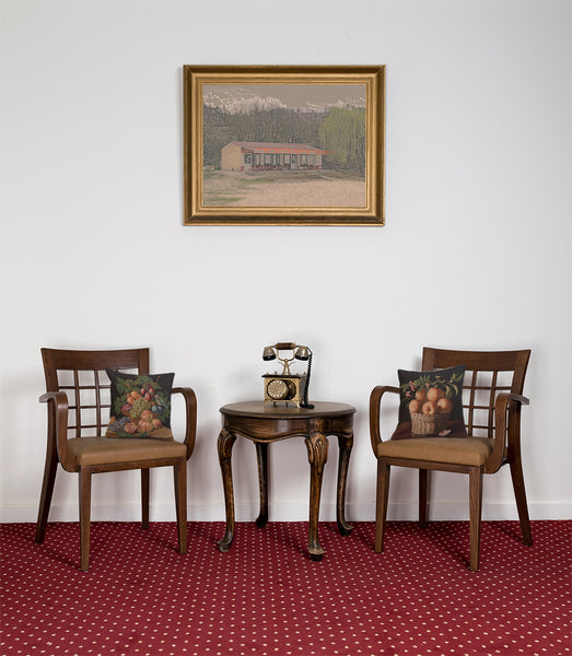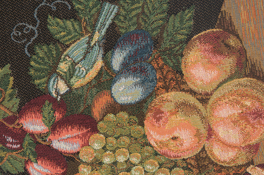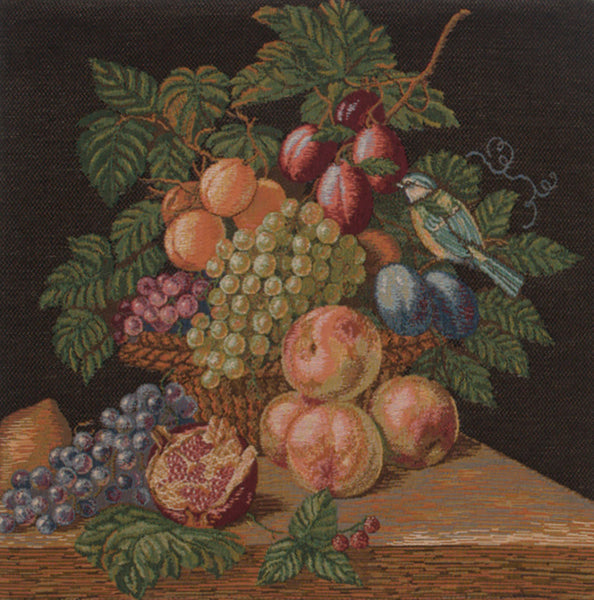 | History: | Fruit Basket is a European jacquard woven tapestry cushion cover of a still life representing a basket of fruits with a tit bird perched upon it. This charming scene is on a black background. |