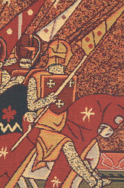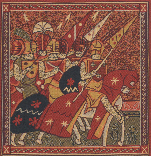 | History: | Inspired by the Dutch Painter himself, our Godfroid Belgium Cushion Cover depicts the medieval scene of the First Crusades of 1096. This handsome historically themed cushion cover brings a timeless touch of the past you’re your modern or traditional interior. Purchase twin cushion covers with the same scene to set on the bed or sofa for a pretty accent. The cover is wonderfully woven in elegant colors from a cotton/viscose/polyester blend for a soft texture and brilliant sheen. Cushion cover backed with lining and zipper. Infill not included. This tapestry is woven in Belgium. |