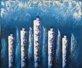 | History: | Icicles is a hand finished canvas oil painting. Vertical pole-shaped figures stand in a symmetrical pyramid composition in blues, and white in this attractive canvas art. These representational forms stand like stiff icicles, with no real rendering of limbs or faces. |