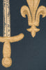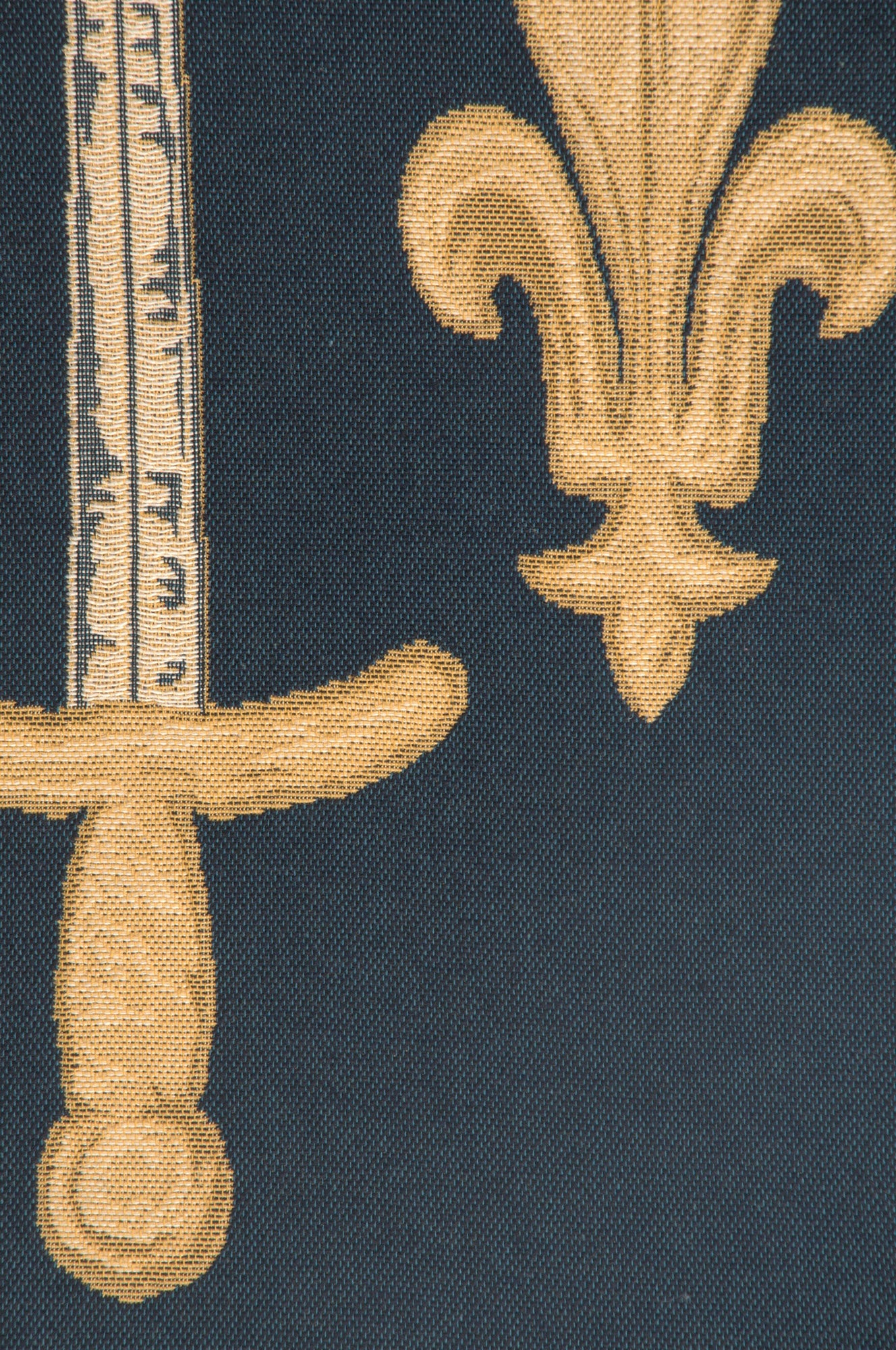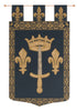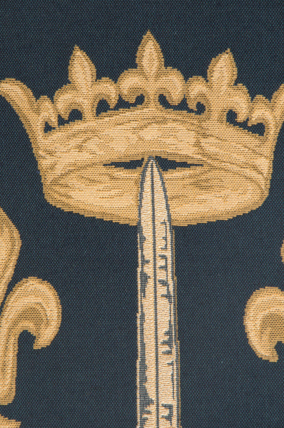| History: | Jehanne D Arc is a European jacquard wall tapestry depicting the Coat of arms of Joan of Arc. This famous woman of history was born in Lorraine in 1412. She played a major and somewhat mysterious role in rallying the flagging forces of Charles VII against the English occupier in 1429. She lead her troops in breaking the siege of Orléans and having Charles VII officially crowned king in Reims the same year. Because of her remarkable actions, Charles VII granted her family arms and nobility. Knowing her deeds points to the symbolism of the arms. |