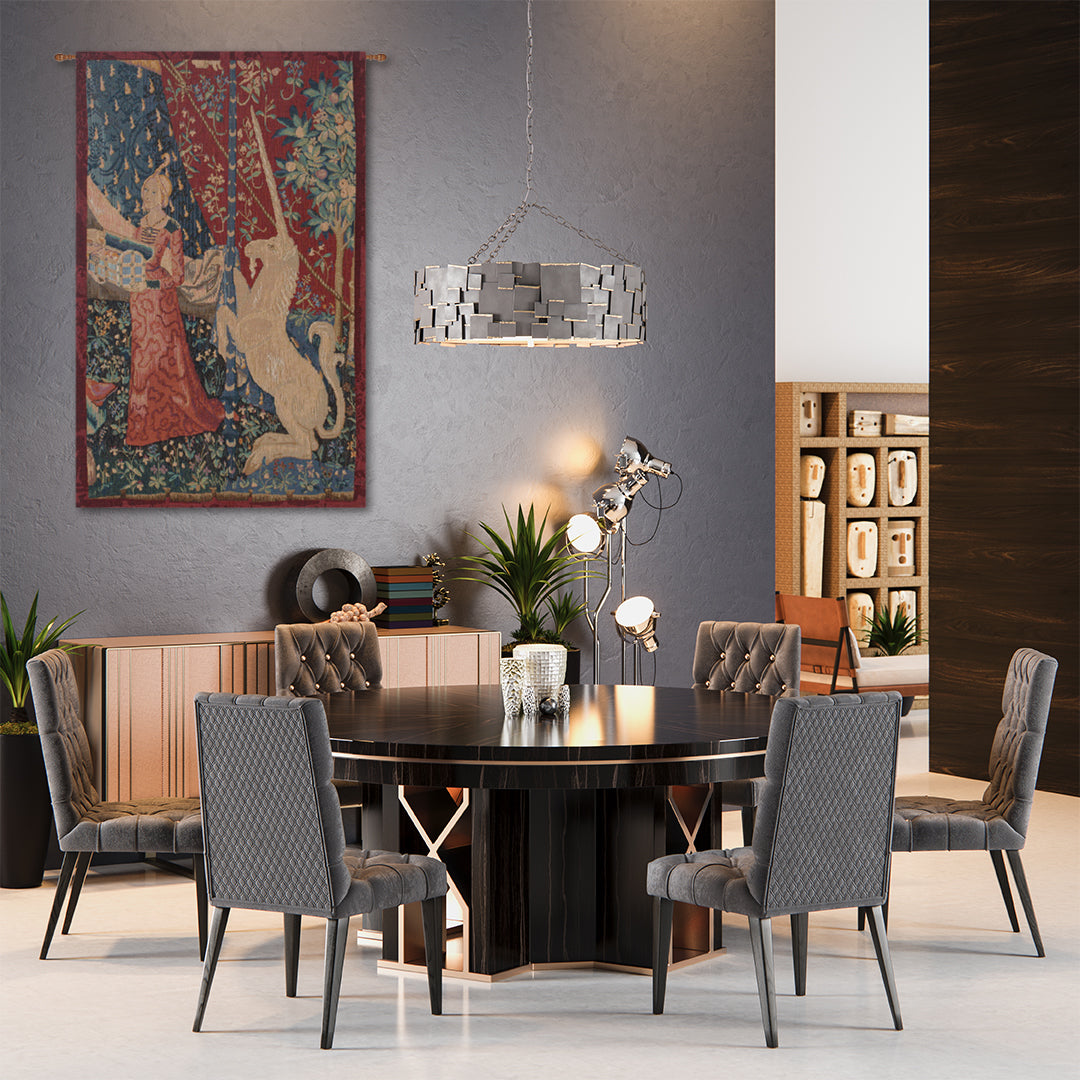 | History: | Jeune fille au coffret, or Young Girl with the Box, is an abstract from one of the famous six tapestries in the The Lady and the Unicorn series. Woven in about 1511 they feature the arms of Jean le Viste. This European wall art tapestry is woven in the jacquard style. |
