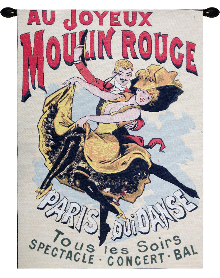| History: | Joyeux Moulin is a Belgian jacquard woven wall tapestry. This piece comes from a vintage fin de siècle French advertisement for the Moulin Rouge Show. Moulin Rouge is best known as the spiritual birthplace of the modern form of the can-can dance. Originally introduced as a seductive dance by the courtesans who operated from the site, the can-can dance revue evolved into a form of entertainment of its own and led to the introduction of cabarets across Europe. Today, the Moulin Rouge is a tourist attraction, offering musical dance entertainment for visitors from around the world. The club's decor still contains much of the romance of fin de siècle France. |