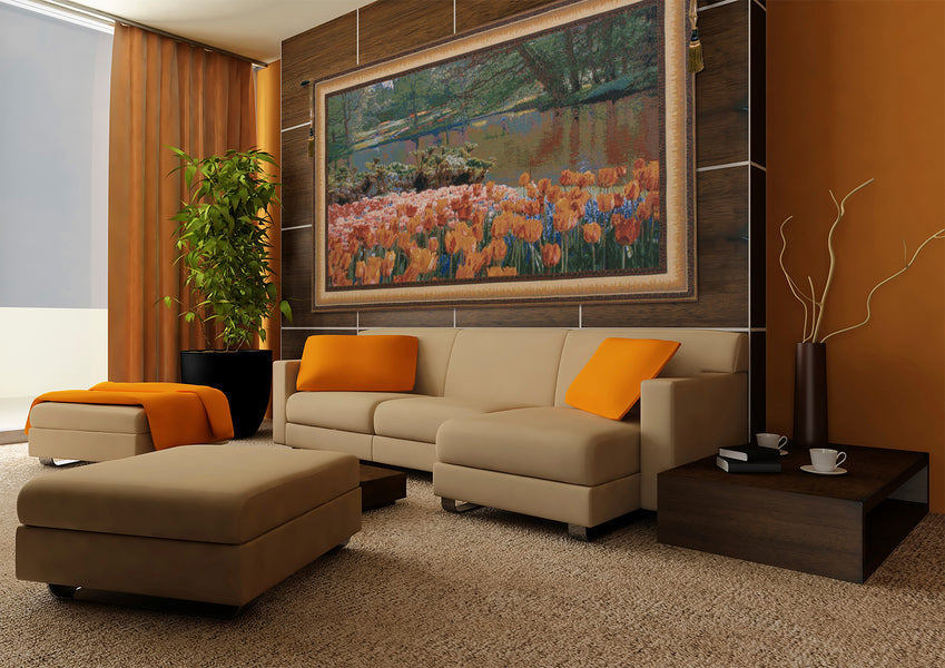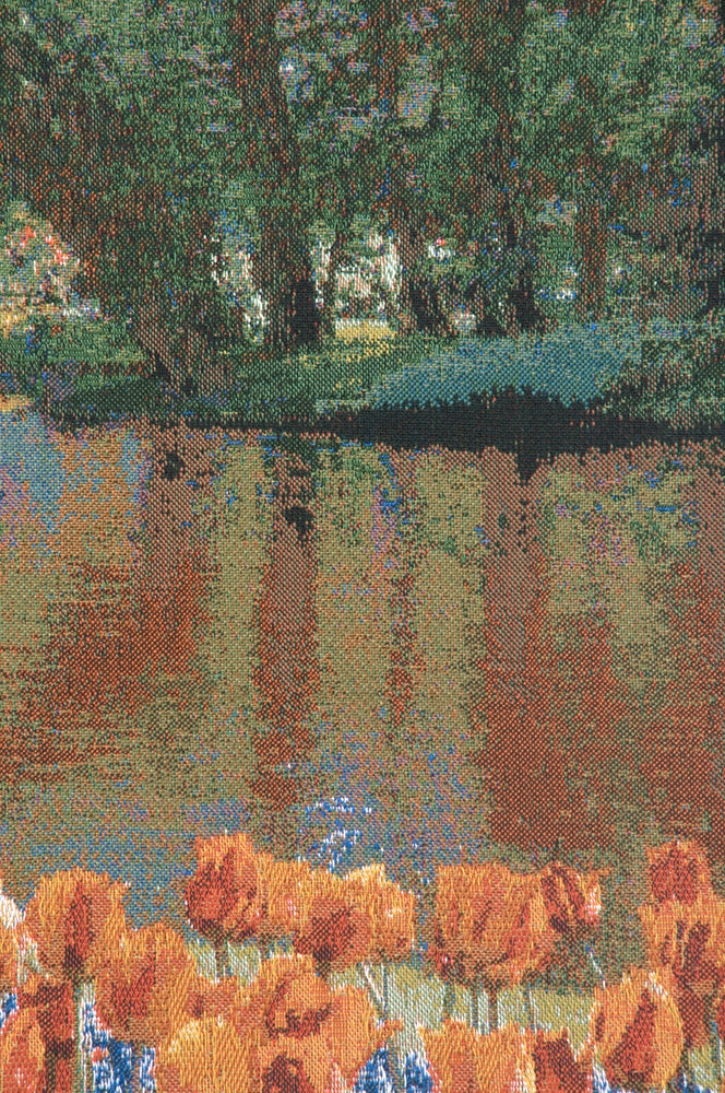 | History: | Keukenhof I Belgian tapestry features the sight of the Keukenhof (the Parc of Nature) Garden. Keukenhof (Court's Kitchen), also known as the Garden of Europe is situated near Lisse, Netherlands, and is the world's largest flower garden. The flower garden was the idea in 1949 of the then-mayor of Lisse, a small town south of Amsterdam. The idea was to have a flower exhibit where growers from all over the Netherlands and Europe could show off their hybrids which will help Netherlands as it is the world's largest exporter of flowers, especially tulips. |