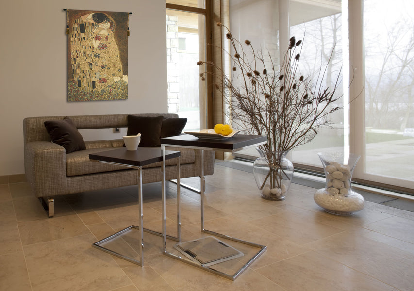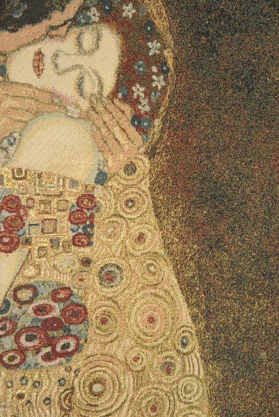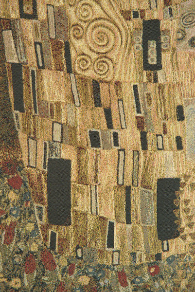 | History: | Kiss of Klimt is an Italian jacquard wall tapestry portraying the work of Gustav Klimt. In 1908, Klimt unveiled The Kiss, which depicts a man bending down to press his lips on the welcoming cheek of a lover, whose closed eyes and tight-lipped smile hint at rapture. The auriferous flourishes and the blending of rectangular features on the male figure with circular counterparts on his partner. There’s a mix of east and west, like so much else in Vienna, as well as a hope for harmony. |