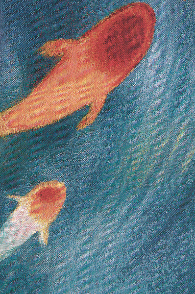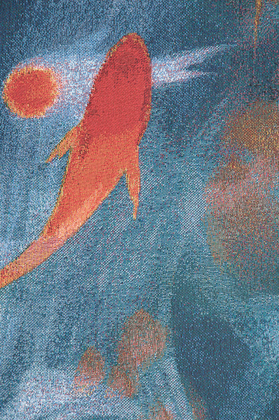 | History: | Koi Pond woven tapestry features an abstract look at swimming koi fish. Koi fish in Oriental culture are a symbol of wealth and prosperity and are a popular choice for water features in and around the home. Here we see the relatively bright orange and white koi contrasting with the darker swirling impressionistic representations of water. The effect of this contrast of color as well as the swirls creates an illusion of movement in the tapestry. |