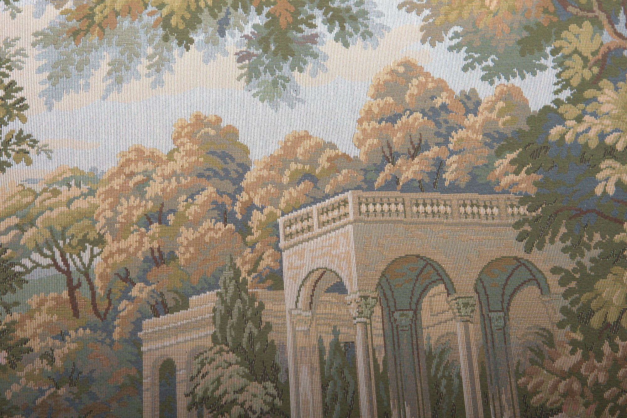 History: Lake Como Italian woven tapestry features an iconic scene of Italy's famous Lake Como set in the 18th century. Italy’s Lake Como takes up the expansive vista to your left. A stone path through the lovely gardens leads to a viewpoint beyond. To the right is the Renaissance styled temple that is part of the villa’s gardens and grounds. This is a delight of peace, beauty and tranquility. The artist, who’s incorrectly said to be Francois Boucher but is actually unknown, has captured the scene brilliantly. The work was based on three paintings from the 17th century but is a true work of art all its own.