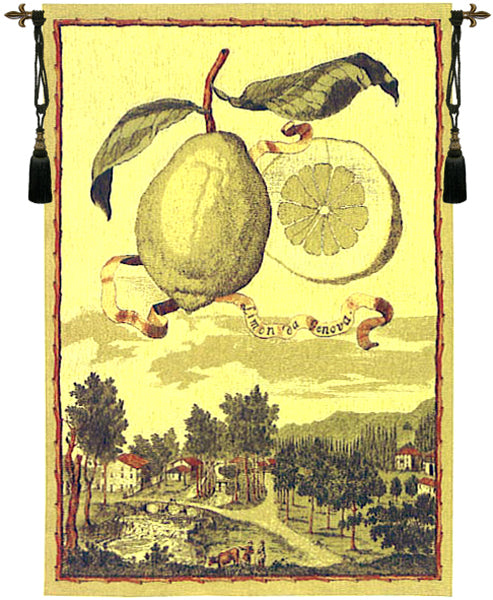 | History: | Lemon De Genova Belgian chenille tapestry features the work of artist Johann Christoph Volkamer (1644 - 1720). At one time associated with evil, the lemon was actually excommunicated by Catalan priests who claimed that the devil had made it imperfect. Thankfully, it proved a godsend to mariners who suffered from scurvy, which was the curse of those who took to the sea. The lack of vitamin C aboard ship became so serious that a man could die within a week’s time of the malady. The lemon offered a natural cure. The lemon’s place in history was assured when King Louis XIV offered gift of lemons to courtesans on the evening of a ball. This lovely tapestry celebrates all that is good with lemons. It pictures a whole and halved lemon, portrayed above the orchards in the Mediterranean from whence they came. |